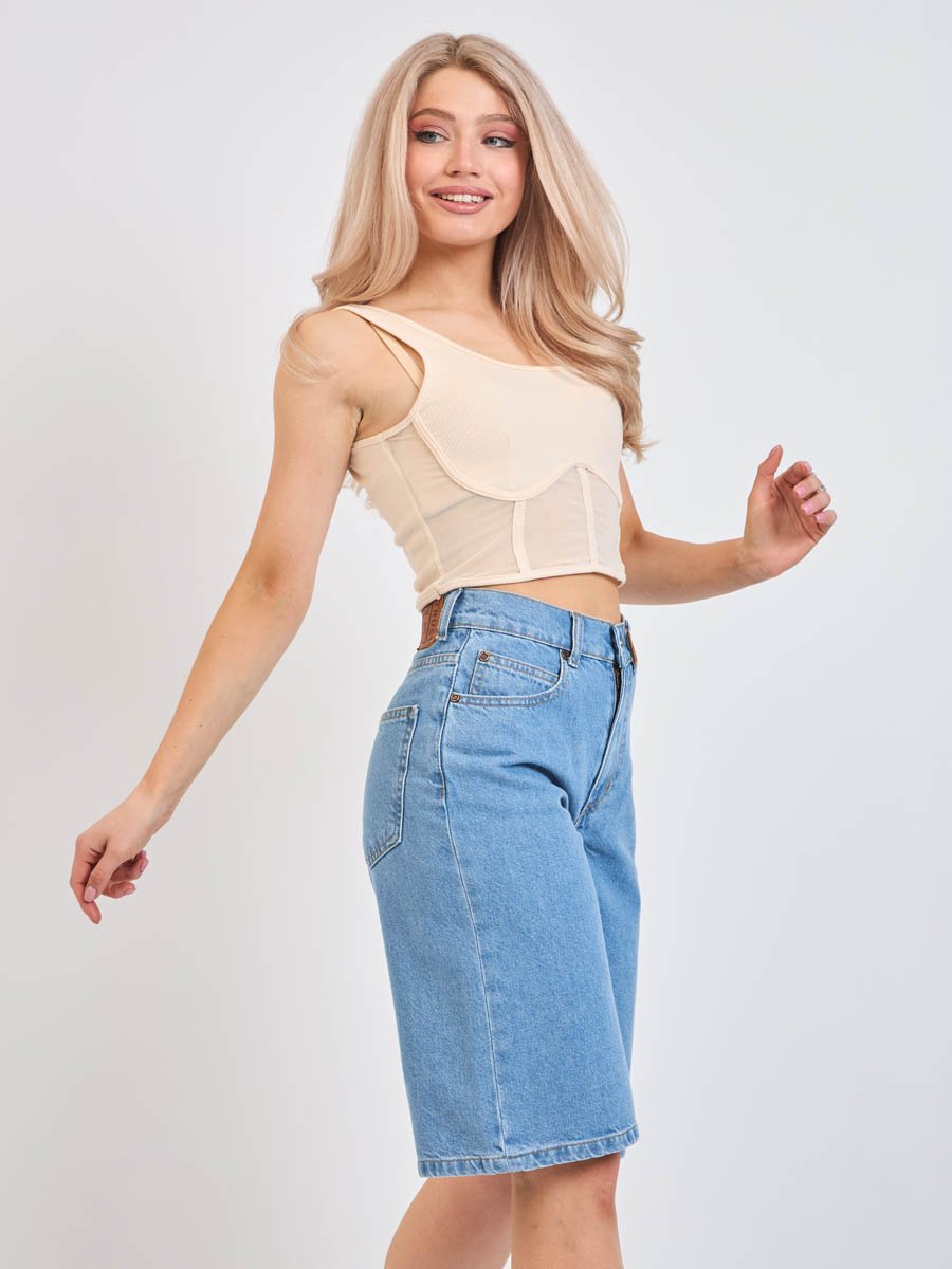 Женские шорты с пятью карманами. Посадка Comfort fit (свободные по бедру),  высокая талия спереди и сзади. Свободные по всей длине, широкий низ. Застежка на молнии.  Выполнены из x/б ткани denim. Классическая средняя машинная стирка с камнями (stone wash). Материал: Blue denim 009