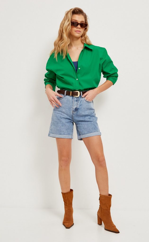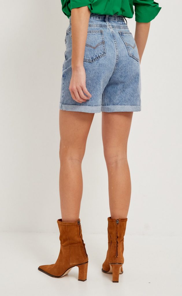 Шорты женские джинсовые от бренда Fine Joyce из натурального денима средней плотности голубого цвета. Шорты высокой посадки, с застежкой на молнии и пуговицу, пояс дополнен шлёвками для ремня, пять карманов, дизайнерская фурнитура. Женские шорты оптом выполнены из голубого денима, длина внутреннего шва 15 см, штанины декорированы отворотами. Шорты слегка расклешенные книзу, комфортны в повседневной носке и не сковывают движений. Джинсовая ткань (100% хлопок) приятно ощущается на теле, пропускает воздух и делает шорты оптом невероятно удобными. Изюминка модели – трендовая высокая посадка, что визуально делает талию уже, а ноги длинее. Шорты оптом от производителя станут прекрасным дополнением Вашего повседневного гардероба, они будут отлично смотреться с футболкой или поло. Эта универсальная модель прекрасно дополнит любой комплект для отдыха, прогулок и поездок на природу, на море. Для Вашего удобства в карточке товара есть фото с мерками. Купить шорты оптом можно на сайте. В карточке товара Вы найдете размерные характеристики, которые помогут Вам определиться с размером. Fine Joyce динамично развивающийся российский бренд. Fine Joyce — высокое качество по оптимальной цене!