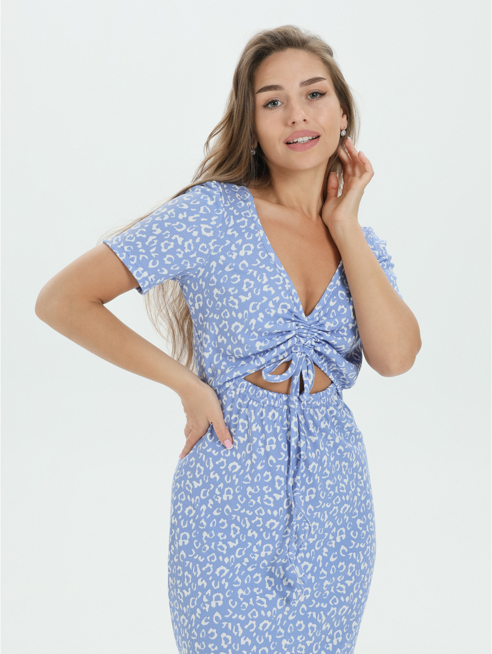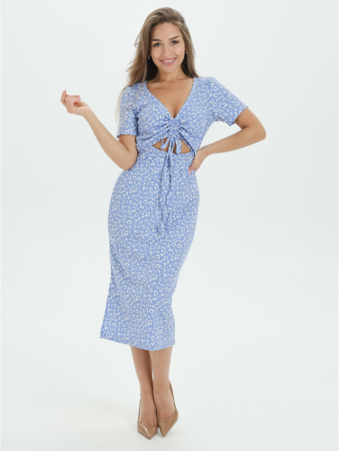 Платье миди, приталенное, отрезное по талии с коротким, втачным рукавом, с шнурками из основного материала.