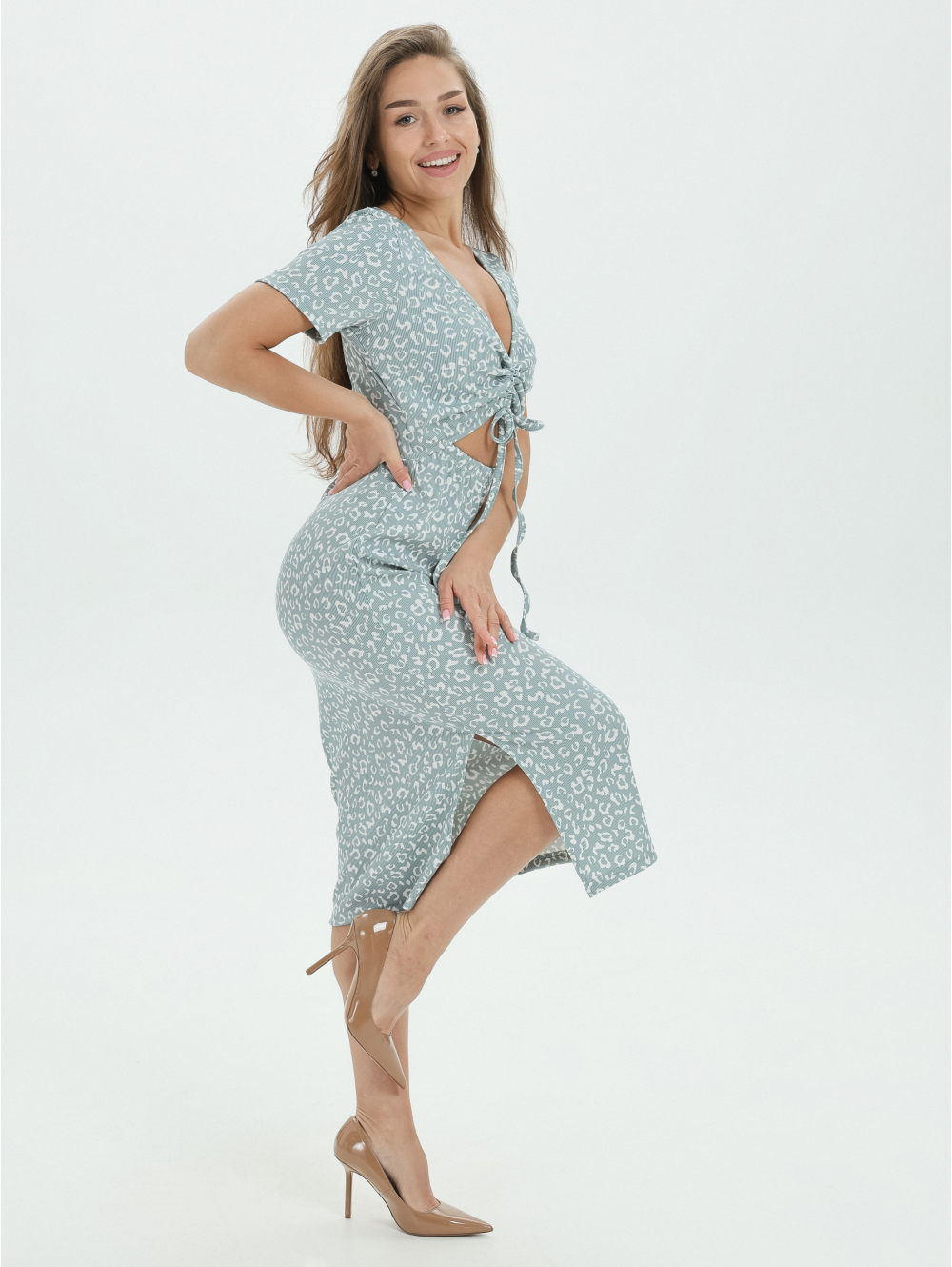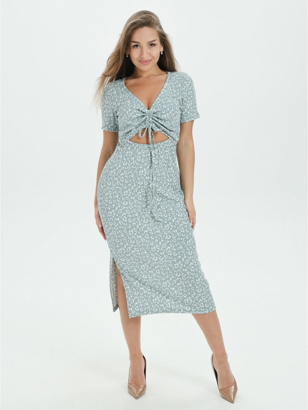 Платье миди, приталенное, отрезное по талии с коротким, втачным рукавом, с шнурками из основного материала.