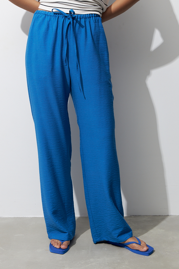 Брюки прямого силуэта из вискозной ткани с крэш-эффектом. Пояс с эластичной резиной и кулиской, в боковых швах карманы.