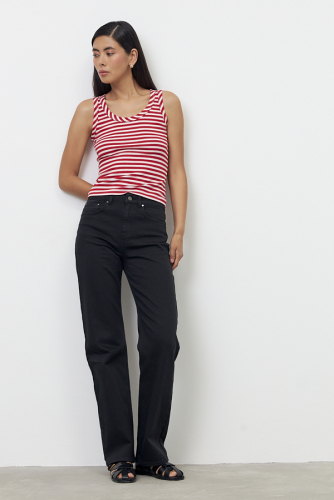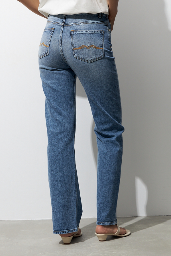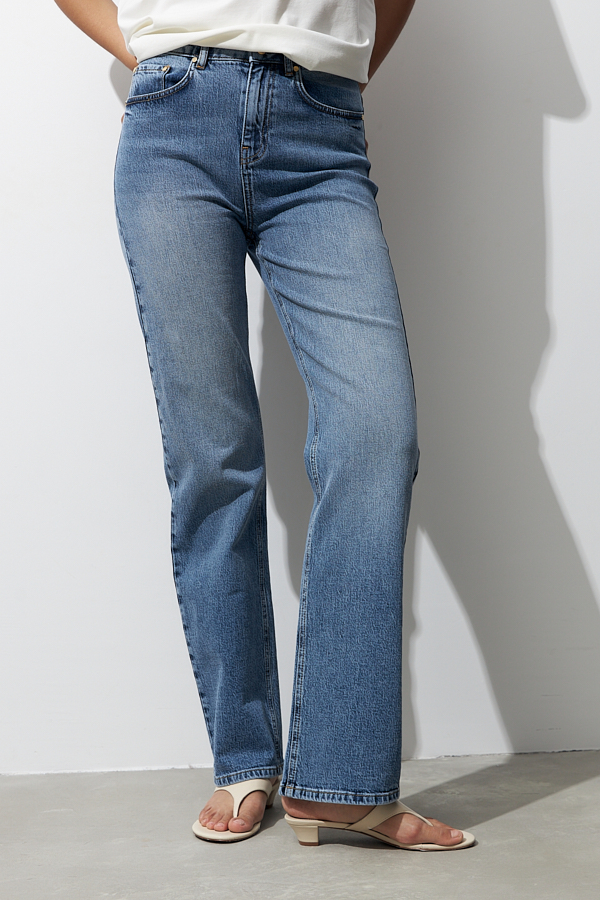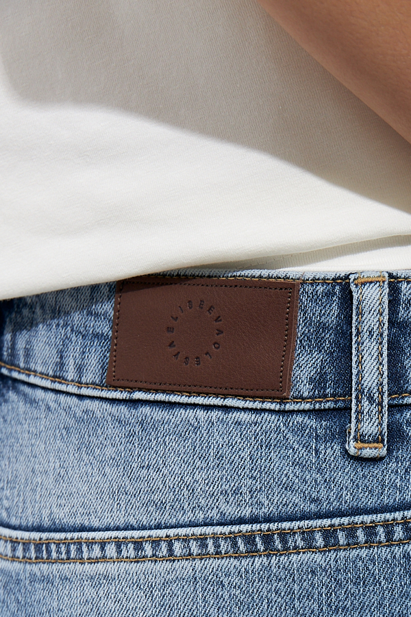 Брюки из эластичного денима выполнены по классической джинсовой технологии (варка с эффектом легкого выбеливания). Прямой классический крой. На задней части брюк выполнены накладные карманы, на передней - карманы с подкройным бочком. Притачной пояс со шлёвками. Застёжка на молнию-гульфик и пуговицу.