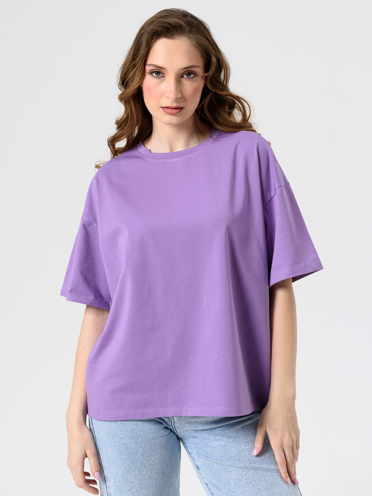 Футболка женская свободной формы, из гладкокрашенного трикотажного х/б полотна с лайкрой, в стиле «Oversize». Круглая горловина. Спущенную линию плеча, продолжает втачной рукав, до линии локтя.