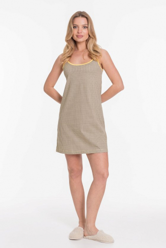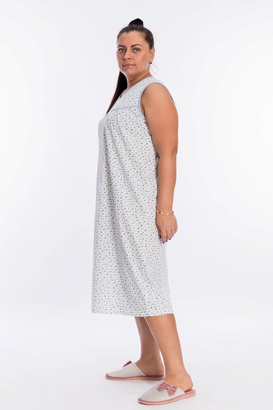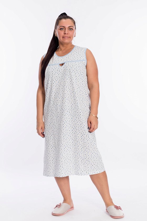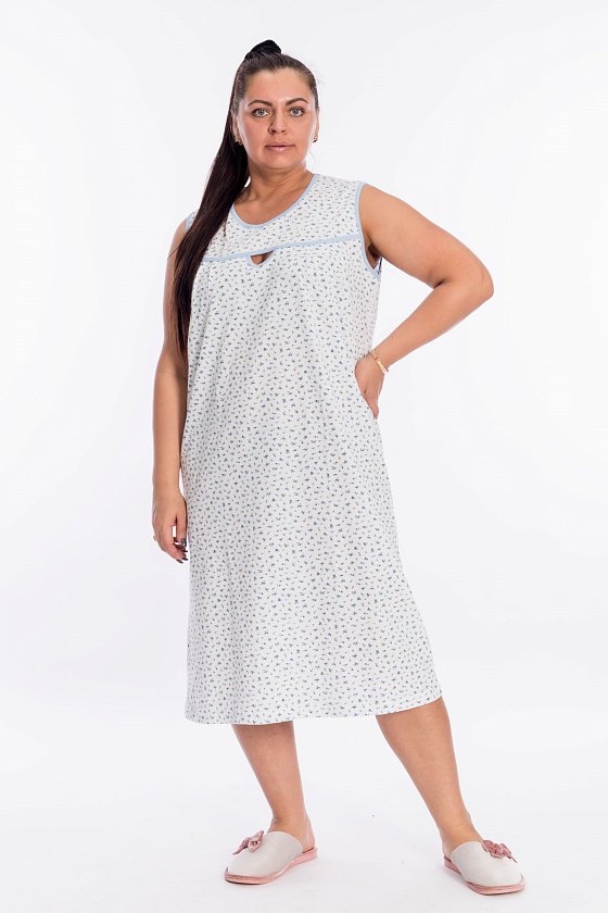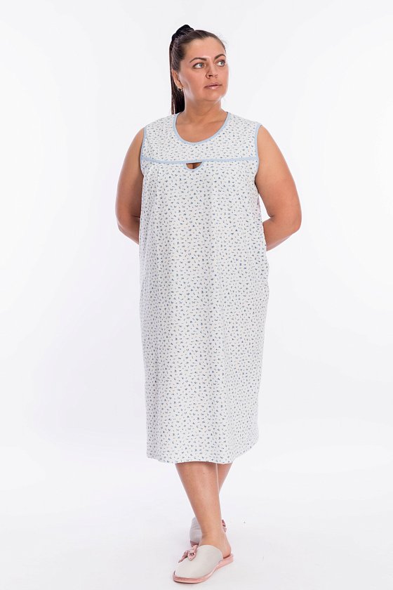 Сорочка женская выполнена из 100% хлопка, свободный покрой обеспечивает комфорт во время сна. В качестве отделки спереди сделан декоративный элемент в форме капли. Горловина и проймы декорированы бейкой контрастного цвета.