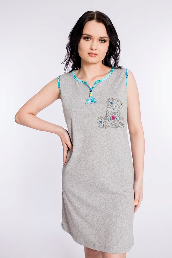 Сорочка молодёжная выполнена из кулирного полотна. Проймы, горловина и застёжка обработаны бейкой контрастного цвета. На застежке пришиты две пуговицы и бантик из атласной ленты. Спереди расположен принт.