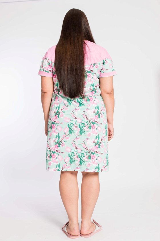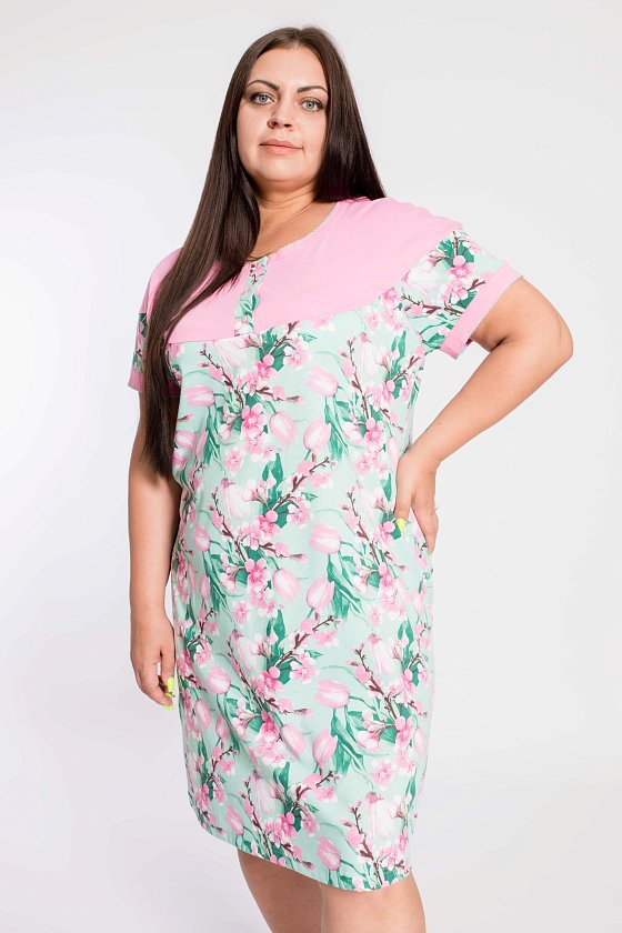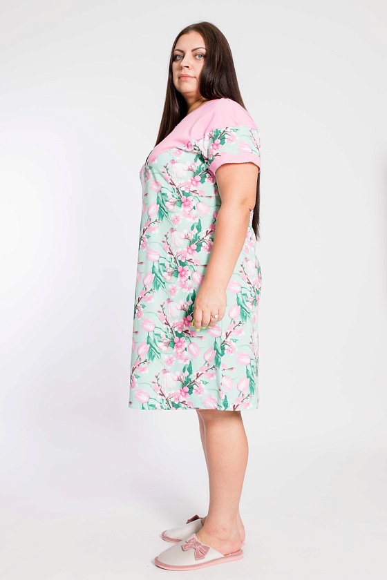 Сорочка женская выполнена из натурального хлопкового полотна. Линия плеча спущена, спереди и на спинке расположены кокетки из однотонного полотна. Вырез горловины круглый, с планкой с застежкой на пуговицы. По горловине и низу манжет отделочная строчка "креш".