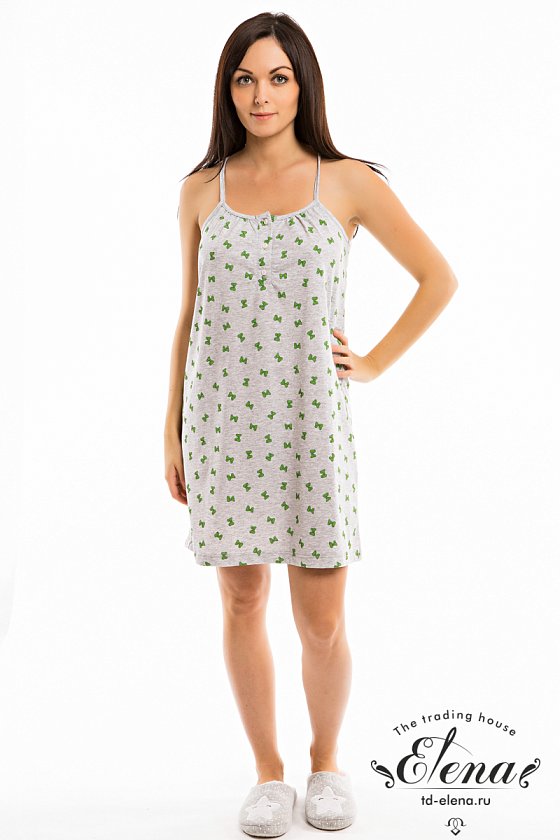 Сорочка из кулирки на тонких бретелях. Силуэт сорочки свободный, на полочке небольшая планка с застёжкой на пуговицы и сборки на груди. Спинка оформлена борцовкой.