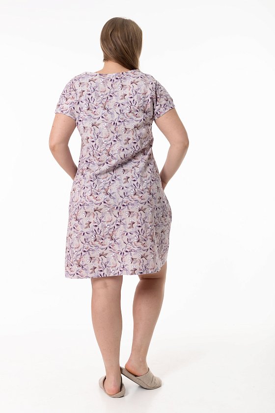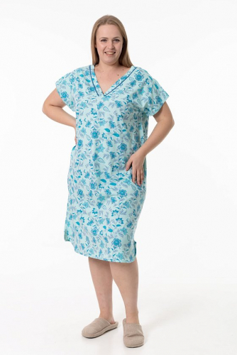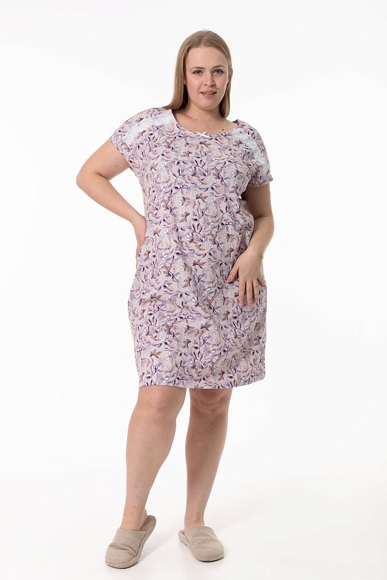 Сорочка выполнена из х/б полотна с набивным рисунком. Линия плеча спущенная, срезы горловины и пройм обшиты бейкой. Спереди сорочка украшена декоративным бантиком и кружевом.