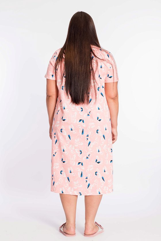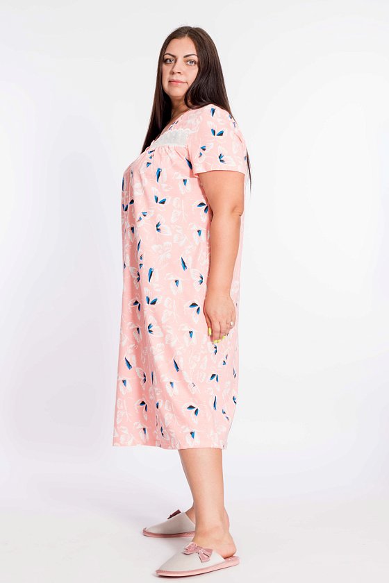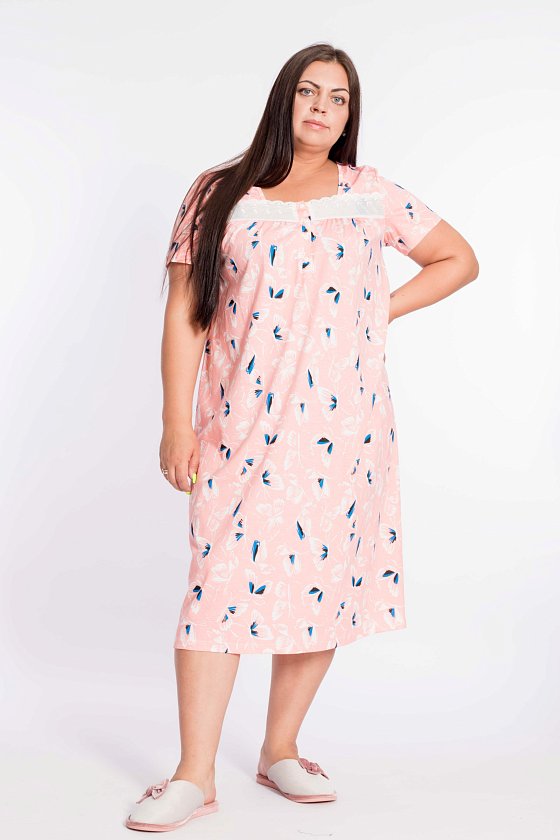 Сорочка из кулирки, 100% хлопок, с коротким втачным рукавом. Спереди отделка кружевом, втачная планка с застёжкой на пуговицы, от низа кокетки заложены складки.