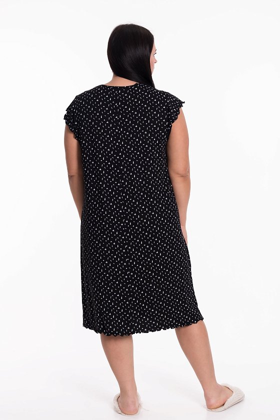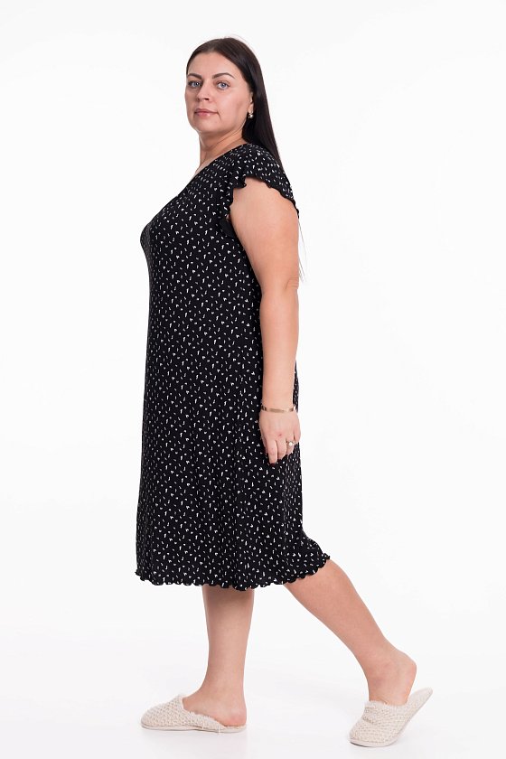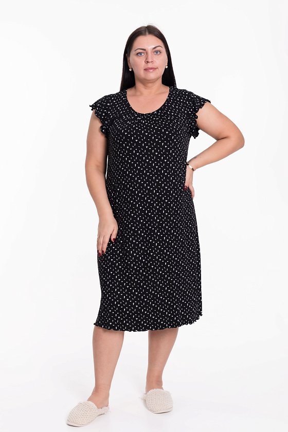 Женская сорочка выполнена из вискозного полотна с набивным рисунком. Горловина оформлена бейкой из основного полотна. Низ рукавов и изделия обметаны декоративным стежком "пике".