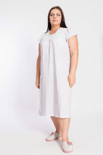 Сорочка выполнена из хлопковой ткани с набивным рисунком. Покрой свободный, широкие бретели и вырез горловины оформлены контрастной по цвету бейкой.