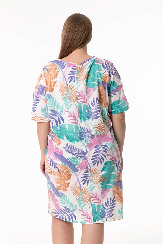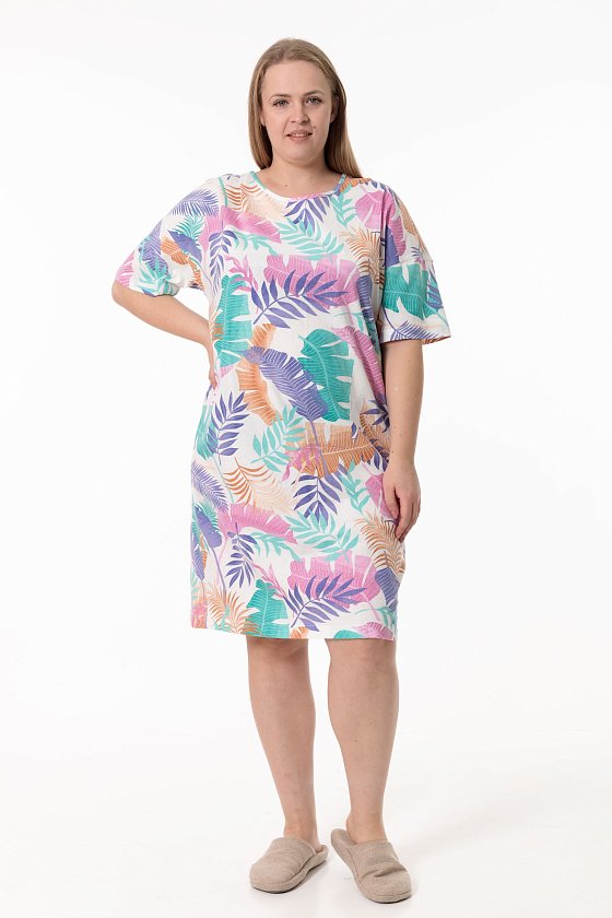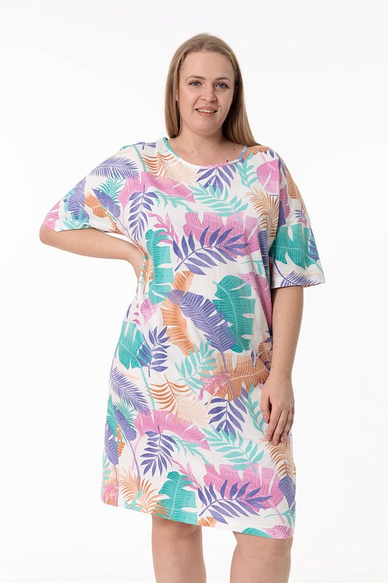 Сорочка выполненная из кулирки — женственная модель для комфортного отдыха. Модель свободного кроя, объёмная в верхней части и плавно зауженная к низу, с коротким спущенным рукавом. Горловина овальной формы аккуратно обработана контрастной бейкой. Длина сорочки до уровня колен создает удобный и лаконичный силуэт.