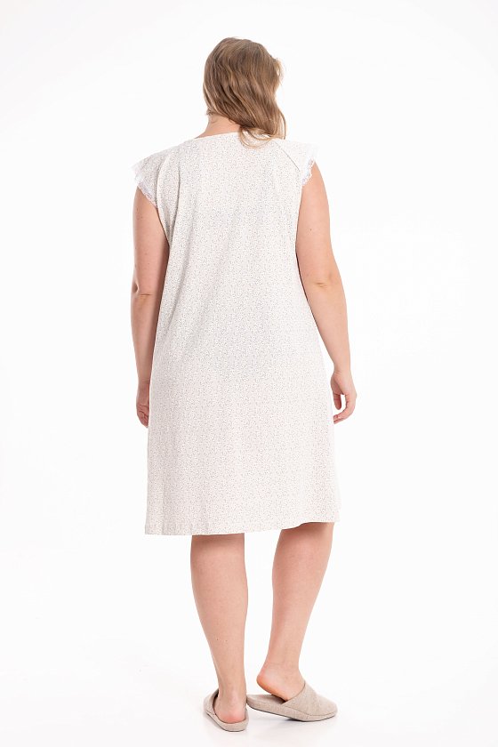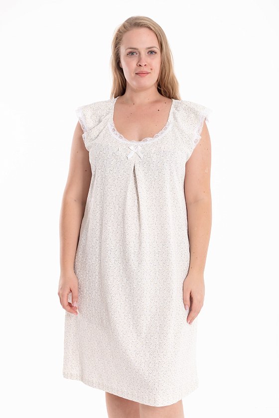 Женская сорочка из мягкой рибаны с нежной набивкой. Свободу силуэту придают изящные складки по центру. Модель украшена кружевом по низу рукавов и верхнему срезу кокетки. Завершает образ элегантный бантик спереди.