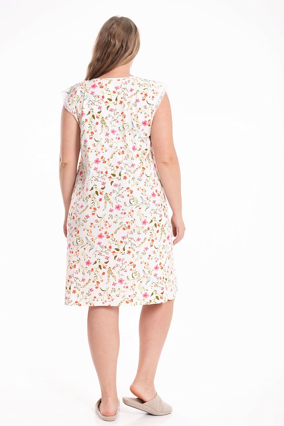 Женская сорочка из мягкой рибаны с нежной набивкой. Свободу силуэту придают изящные складки по центру. Модель украшена кружевом по низу рукавов и верхнему срезу кокетки. Завершает образ элегантный бантик спереди.