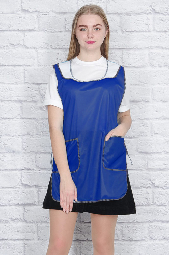 Женский фартук с закрытой спинкой для рабочего персонала. Горловина с воротничком, большие карманы, по бокам завязки регулируют объём изделия.