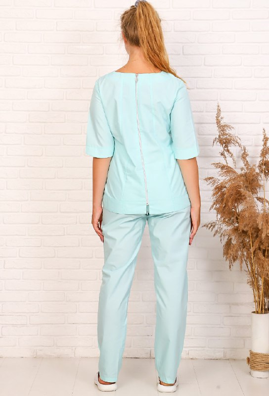 Костюм для медицинского персонала. Курточка приталенного силуэта, с вытачками, сзади застёгивается на молнию. На полочке два внутренних кармана, рукав удлинённый. Брюки слегка зауженной модели, пояс на широкой резинке.