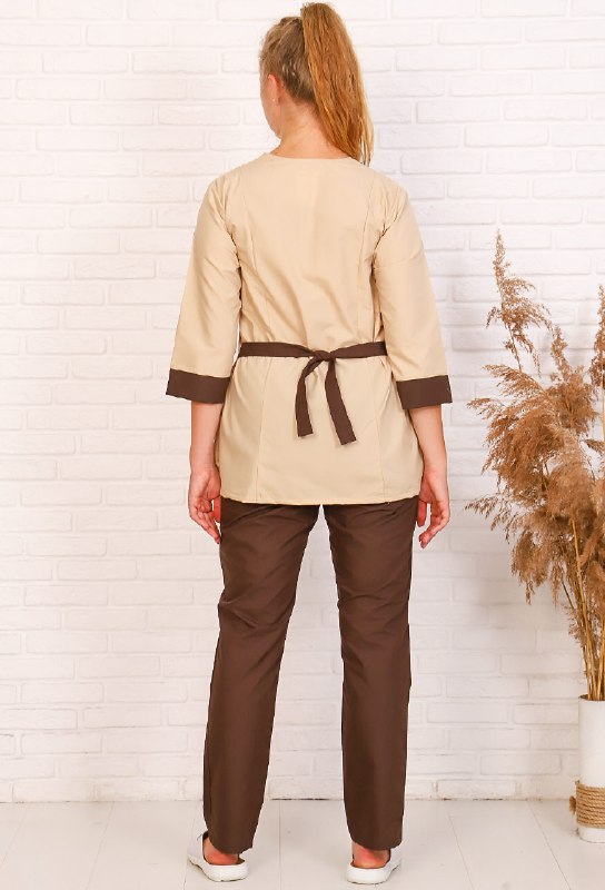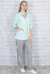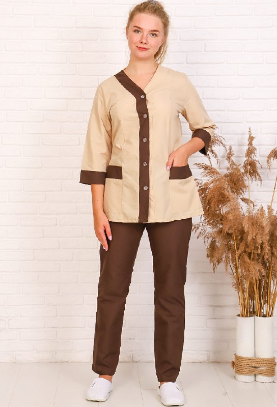 Комбинированный костюм для медицинских работников. Курточка на пуговицах, с глубокими рельефными вытачками спереди и на спинке. Удобные накладные карманы, рукав 3/4, сзади поясок. Брюки прямого кроя, пояс на резинке.