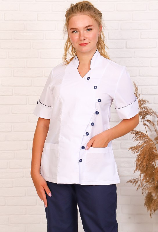 Китель с глубокими удобными карманами, воротник-стойка, рукав втачной с манжетом. Застёжка на пуговицах необычной фигурной линией, сзади хлястик.