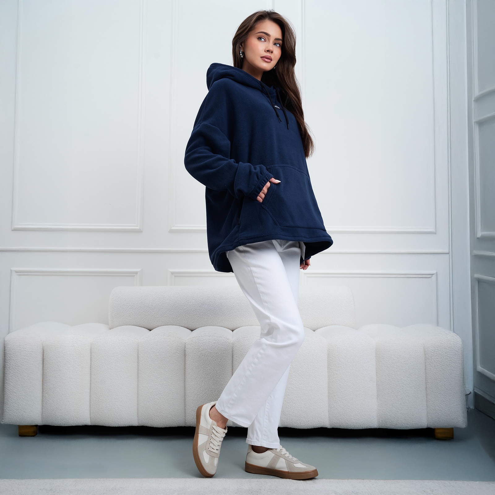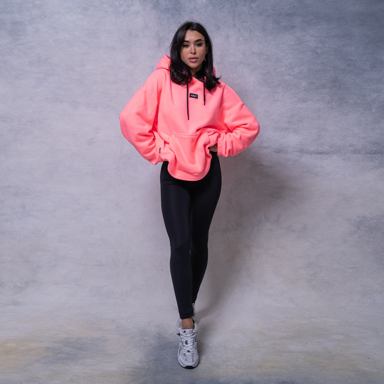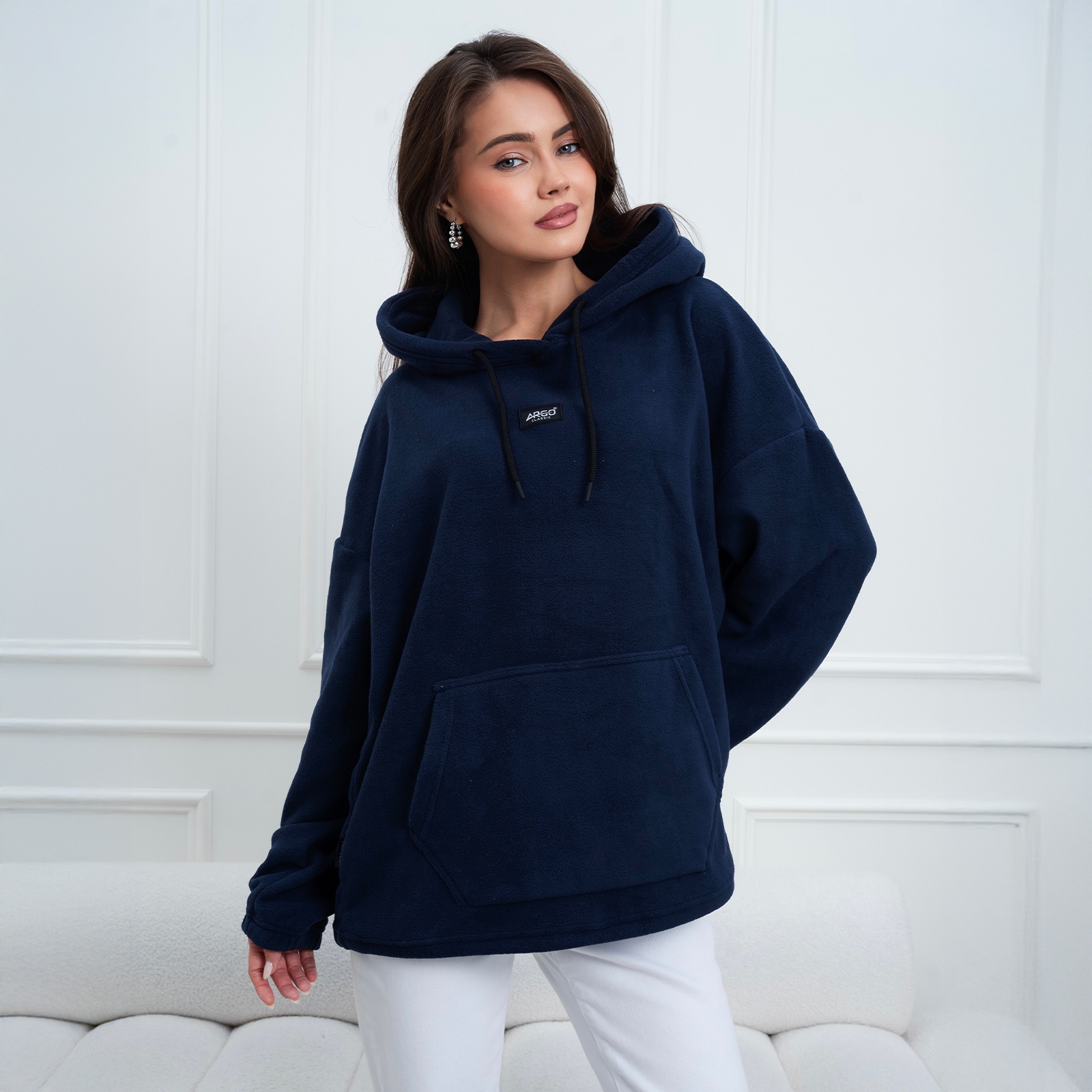 Женская худи с капюшоном и накладным карманом.
