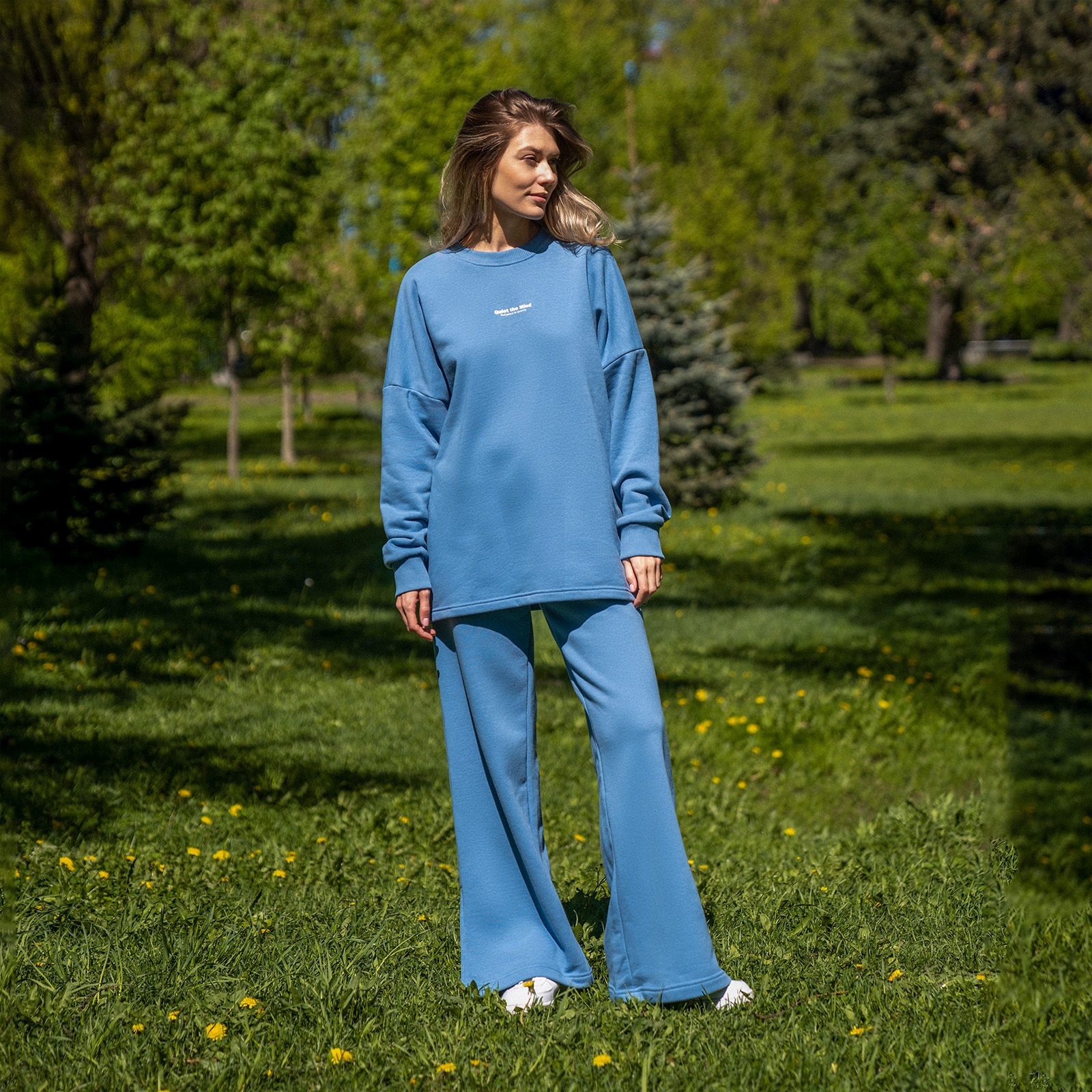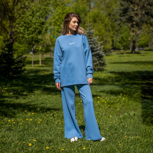 серо-голубой Женские брюки прямого кроя, с разрезами по боковым швам (принт "Quiet the Mind").Материал: