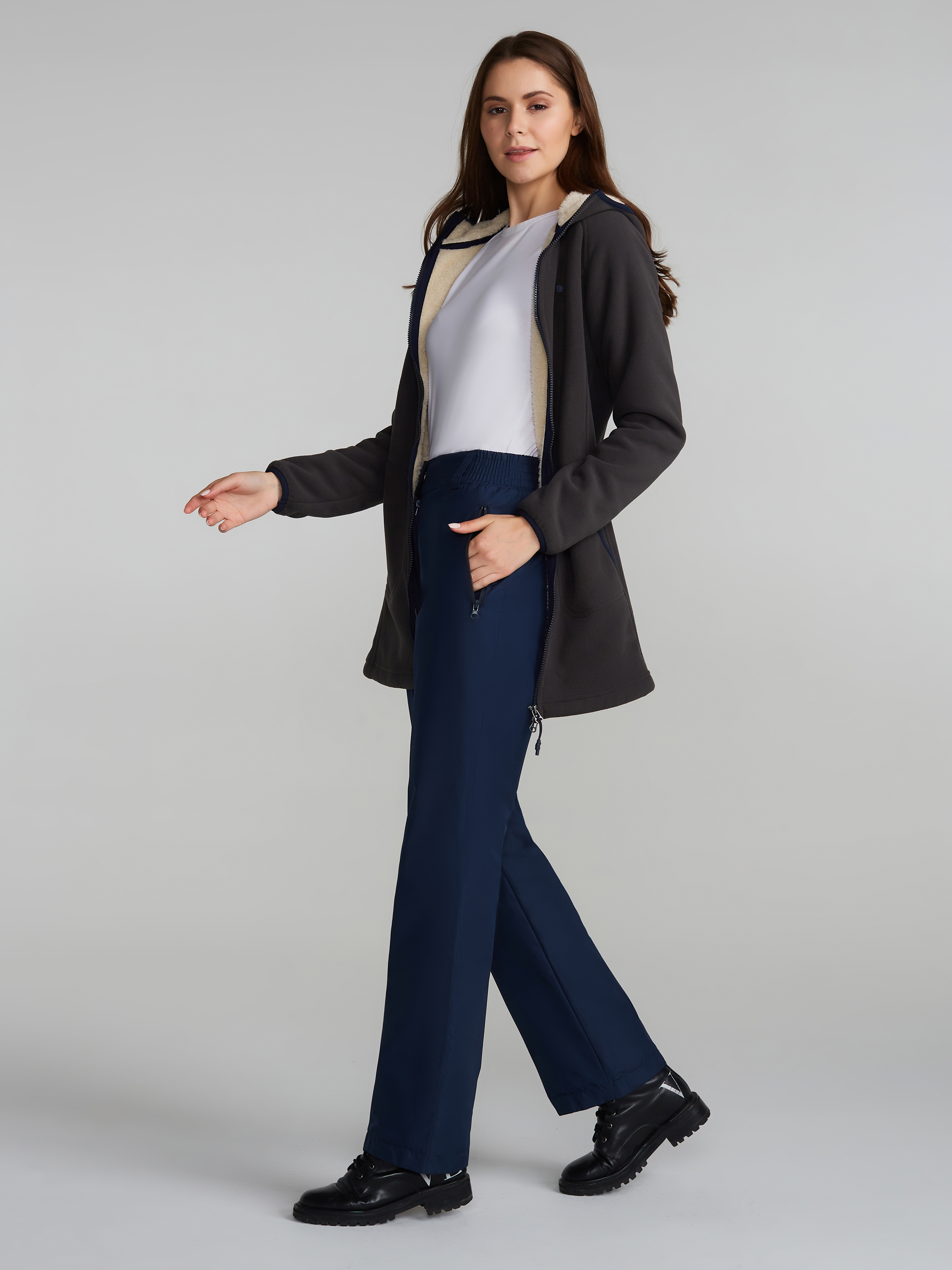 Женские зимние утепленные брюки - отличный выбор для холодного времени года. Они изготовлены из прочного и водоотталкивающего материала. Подкладка выполнена из флиса, что создает дополнительную воздушную прослойку для поддержания температурного режима. На передних половинках выполнены прорезные карманы с открытой молнией. Застежка на молнии с фиксатором и кнопкой-крючком на поясе. На задних половинках выполнены кокетки. На поясе расположены "шлевки". верх - 100% ПЭ, подкладка 100% ПЭ