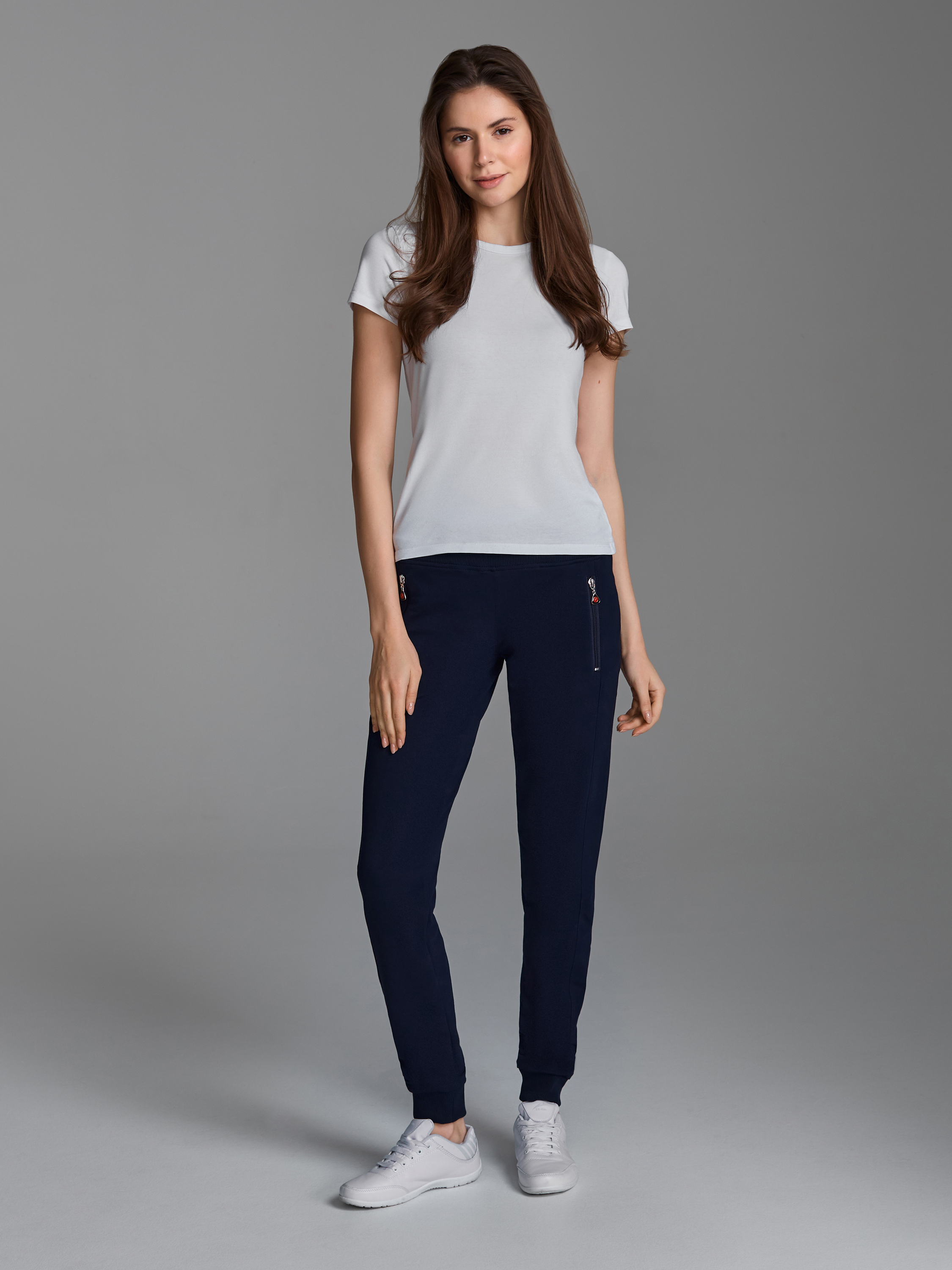 Брюки женские из хлопкового трикотажа приталенного силуэта. Карманы с открытыми молниями выполнены в шве рельефов. Пояс и манжеты выполнен из эластичной трикотажной рибаны на шнурке через люверсы. 77% хлопок, 17% полиэстер, 6% эластан