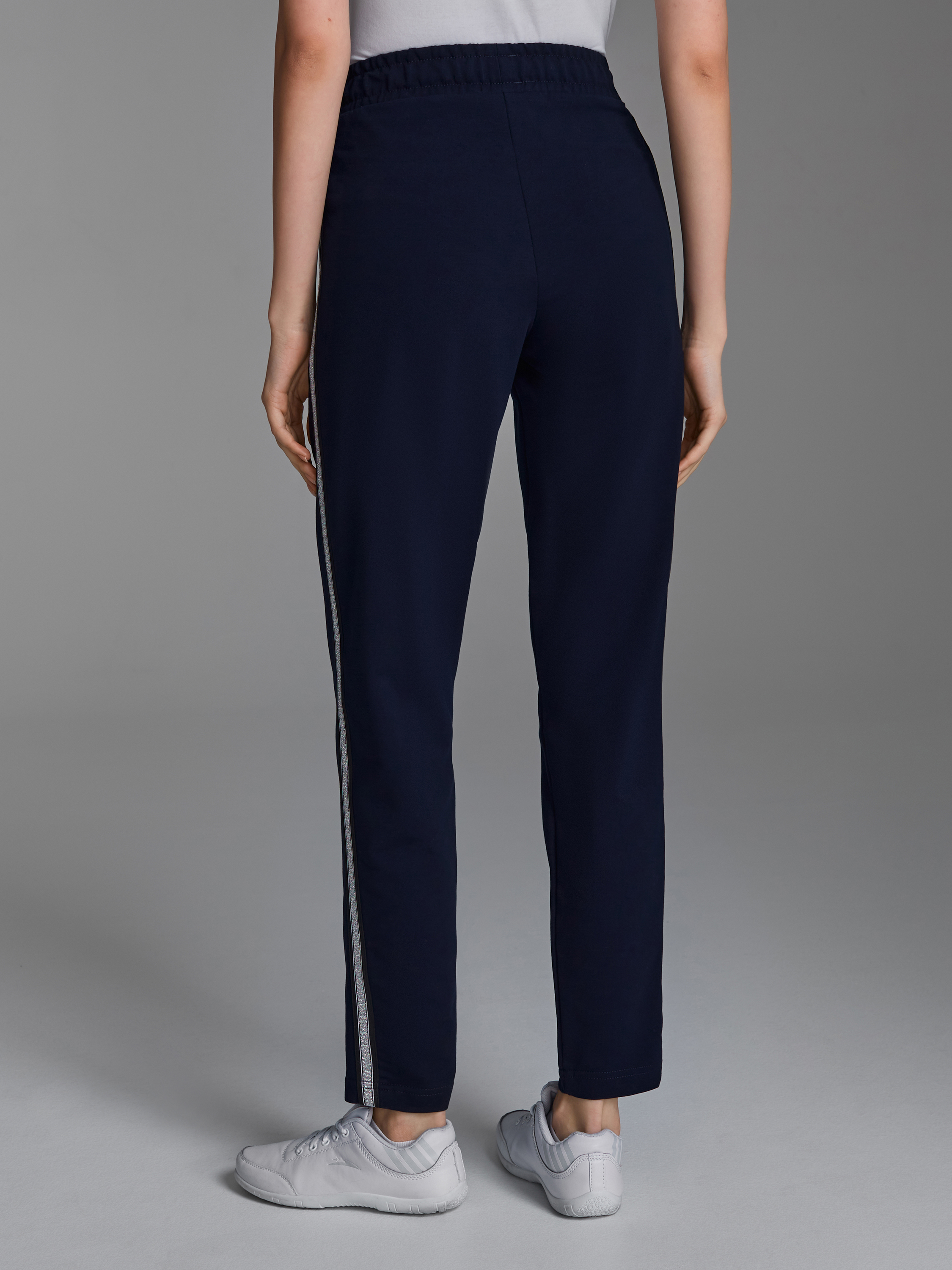 Брюки женские из хлопкового трикотаж в стиле "каррот" с небольшими складками по линии талии. Карманы брюк прорезные, с боковыми вставками. Вдоль боковых швов брюк нашита декоративная трикотажная лента с серебристой нитью. Низ брюк заужен. Пояс брюк настрочен на эластичную резинку, дополнительно регулируется шнуром. 77% хлопок, 17% полиэстер, 6% эластан