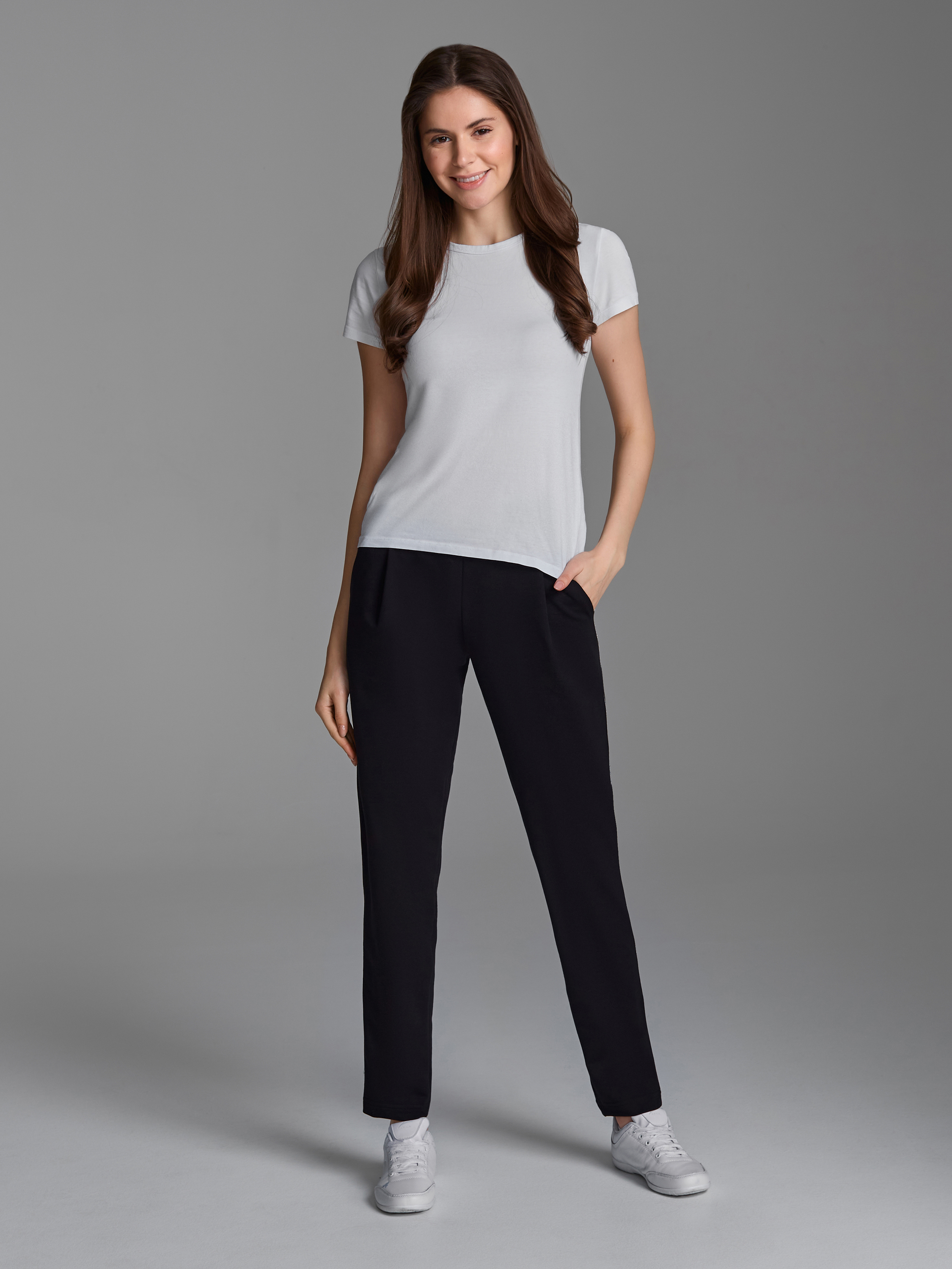 Брюки женские из хлопкового трикотаж в стиле "каррот" с небольшими складками по линии талии. Карманы брюк прорезные, с боковыми вставками. Вдоль боковых швов брюк нашита декоративная трикотажная лента с серебристой нитью. Низ брюк заужен. Пояс брюк настрочен на эластичную резинку, дополнительно регулируется шнуром. 77% хлопок, 17% полиэстер, 6% эластан