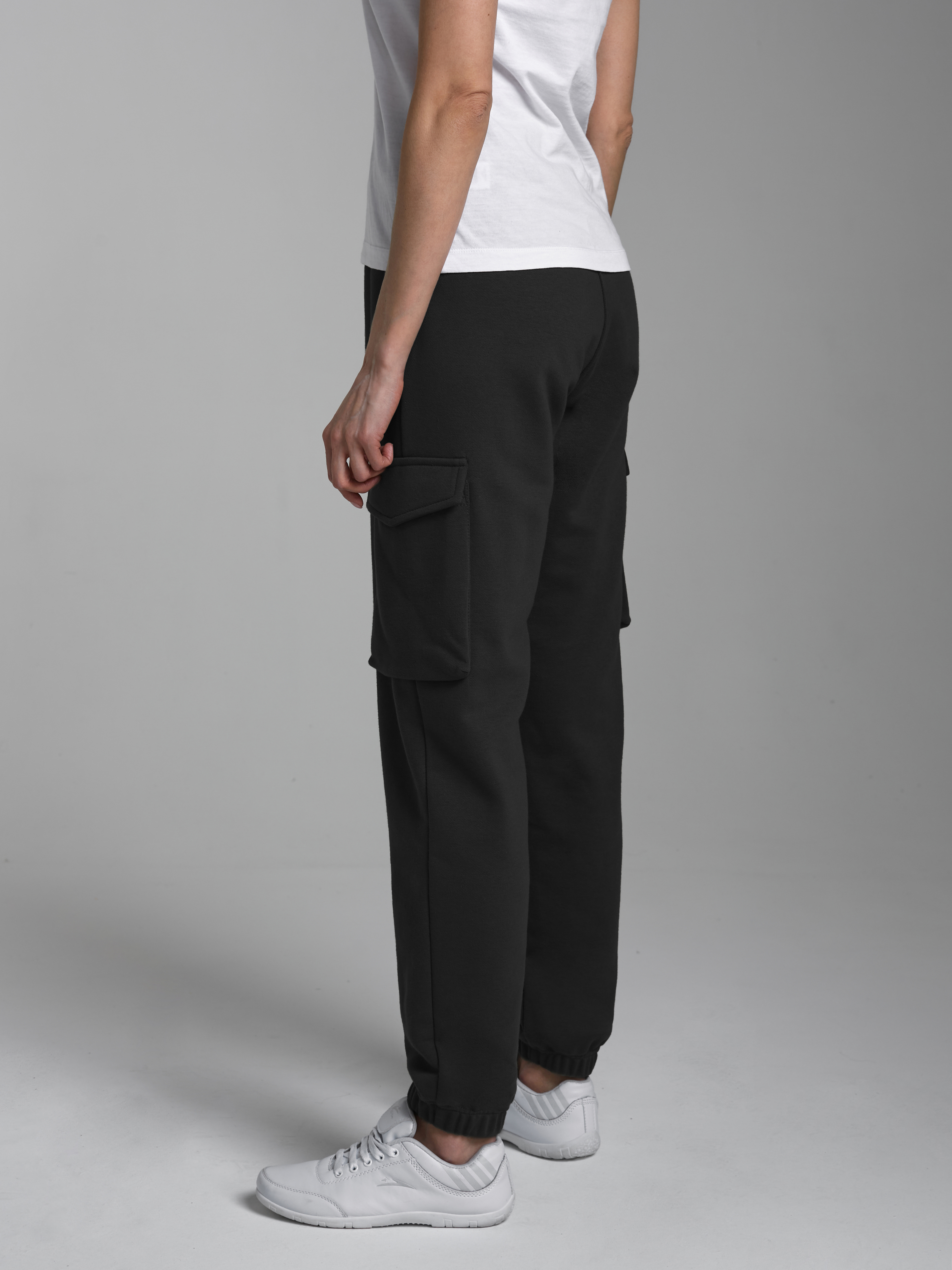 Брюки женские "Карго" из плотного хлопкового трикотажного полотна с петельной изнанкой. Карманы верхние прорезные с бочком. Есть дополнительные боковые накладные карманы, объемные, с клапанами. Низ брюк заужен и присобран на манжету с эластичной резиной. Пояс брюк дополнительно регулируется шнуром. 80% хлопок, 20% полиэстер