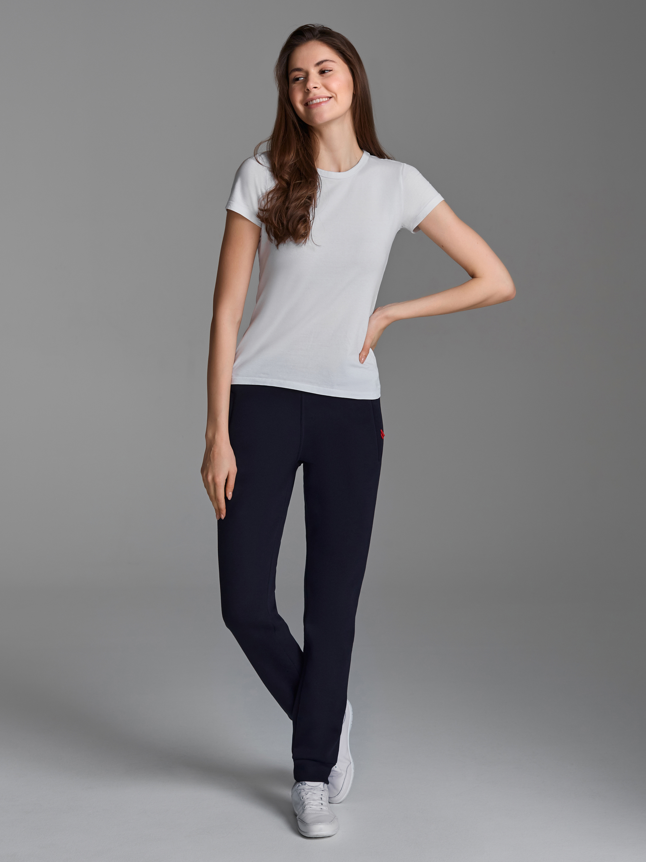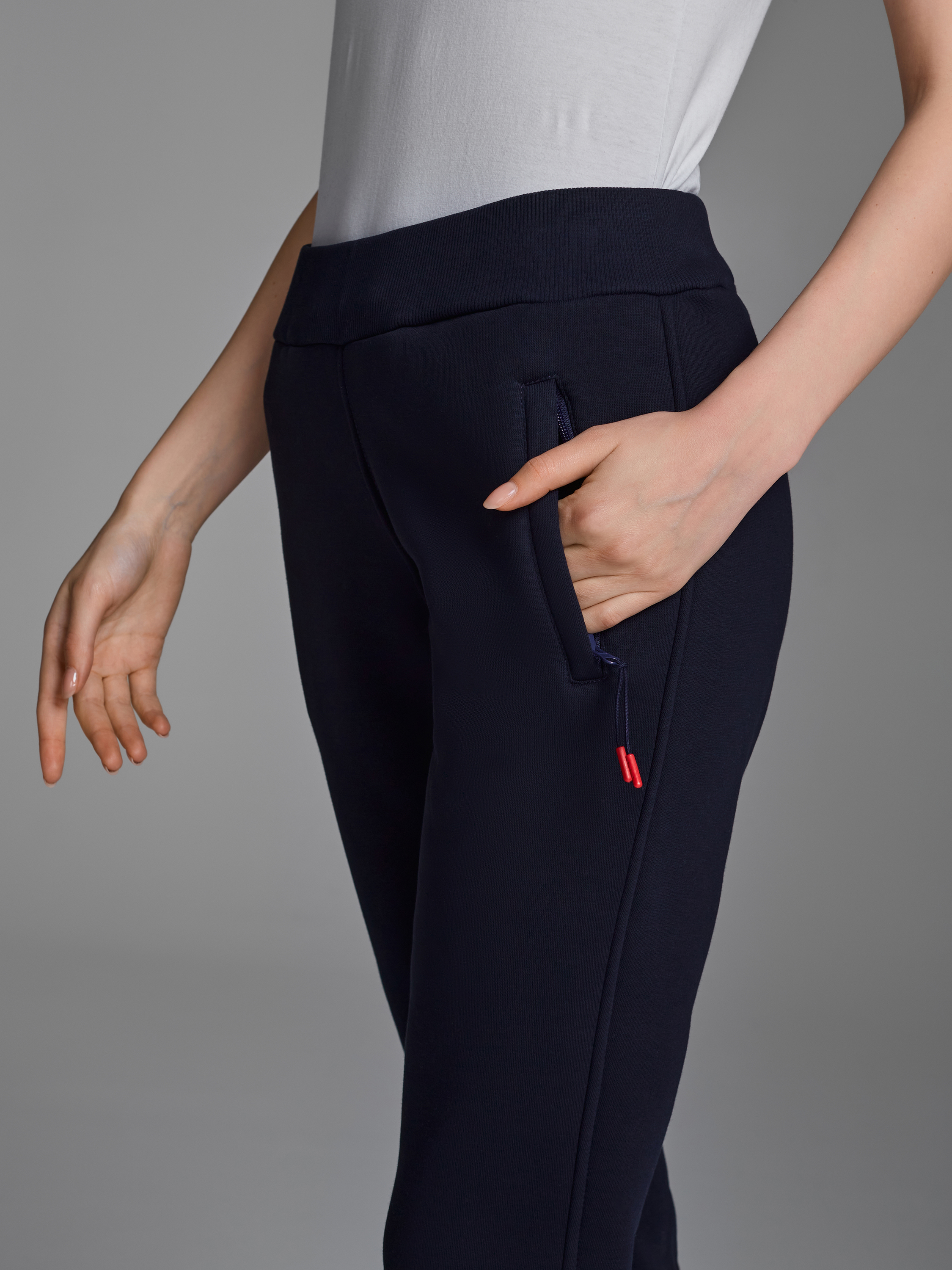 Брюки женские из плотного и мягкого хлопкового трикотажного полотна с изнаночным начесом. Карманы прорезные с листочками и молниями. Пояс брюк и манжеты из эластичного трикотажного полотна рибана. Пояс по линии талии регулируется шнуром. 65% хлопок, 35% полиэстер