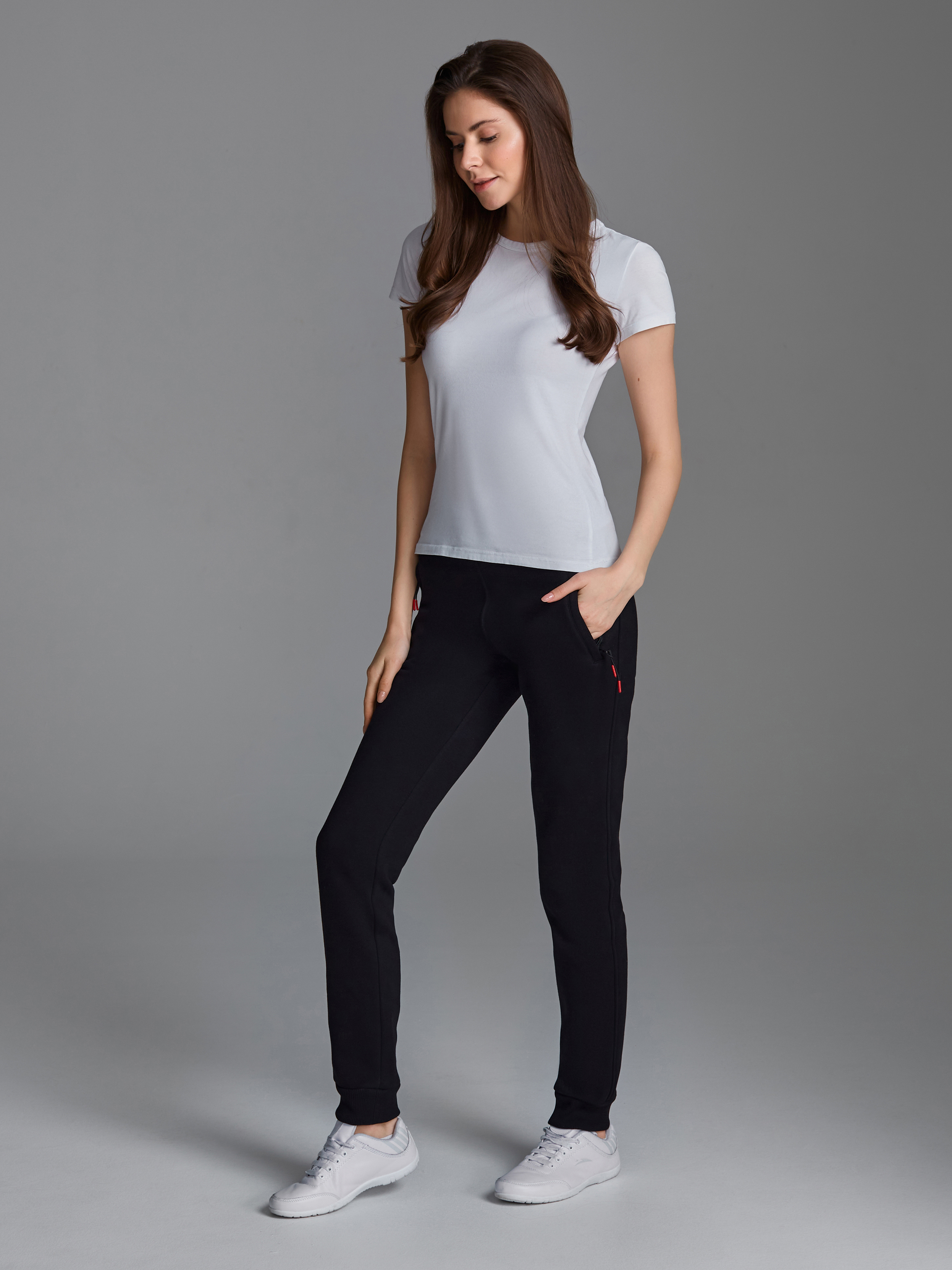 Брюки женские из плотного и мягкого хлопкового трикотажного полотна с изнаночным начесом. Карманы прорезные с листочками и молниями. Пояс брюк и манжеты из эластичного трикотажного полотна рибана. Пояс по линии талии регулируется шнуром. 65% хлопок, 35% полиэстер