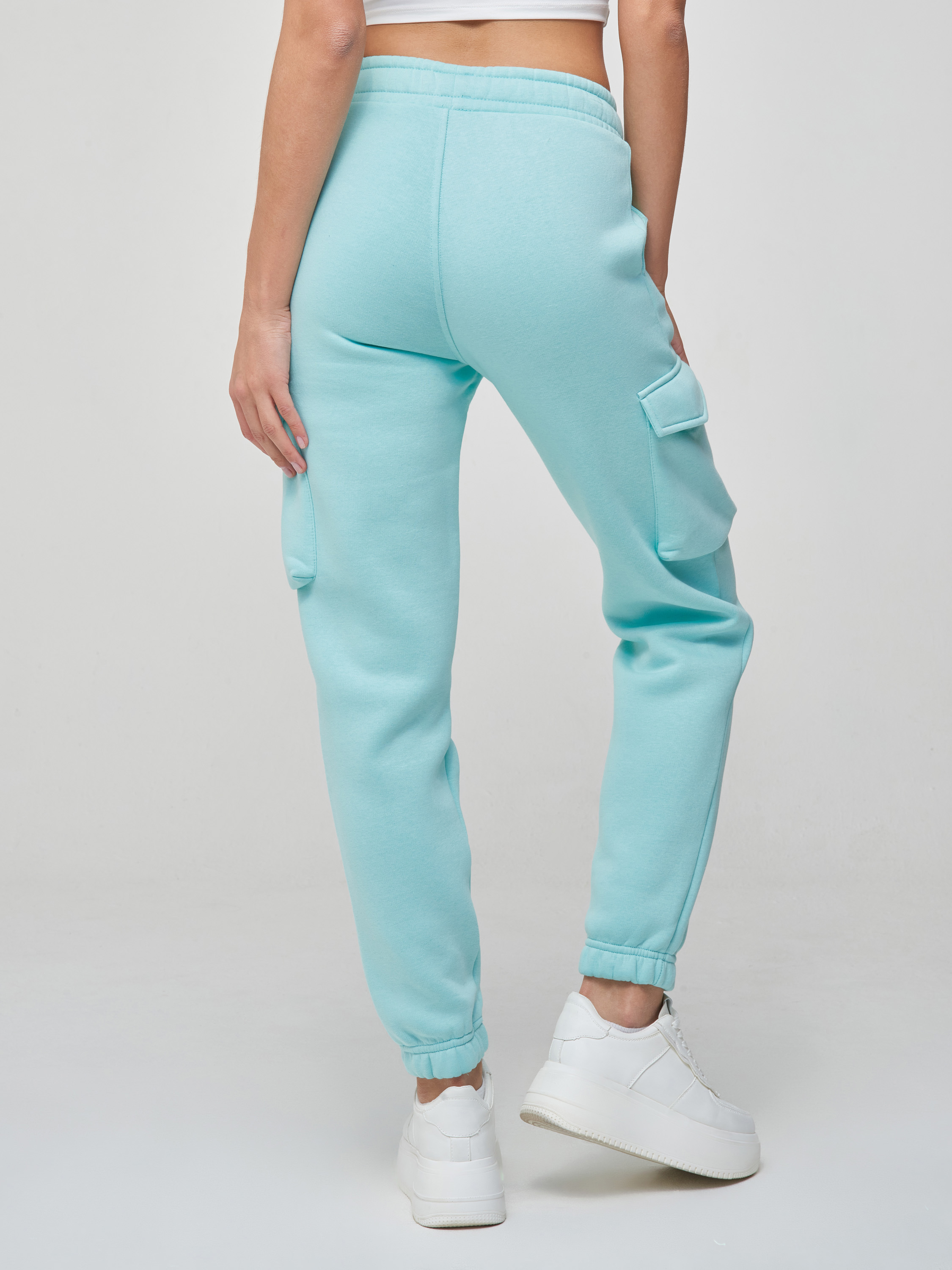 Брюки женские "карго" из плотного и мягкого хлопкового трикотажного полотна с изнаночным начесом. Карманы верхние прорезные с бочком. Есть дополнительные боковые накладные карманы, объемные, с клапанами. Низ брюк заужен и присобран на манжету с эластичной резиной. Пояс брюк дополнительно регулируется шнуром. 65% хлопок, 35% полиэстер