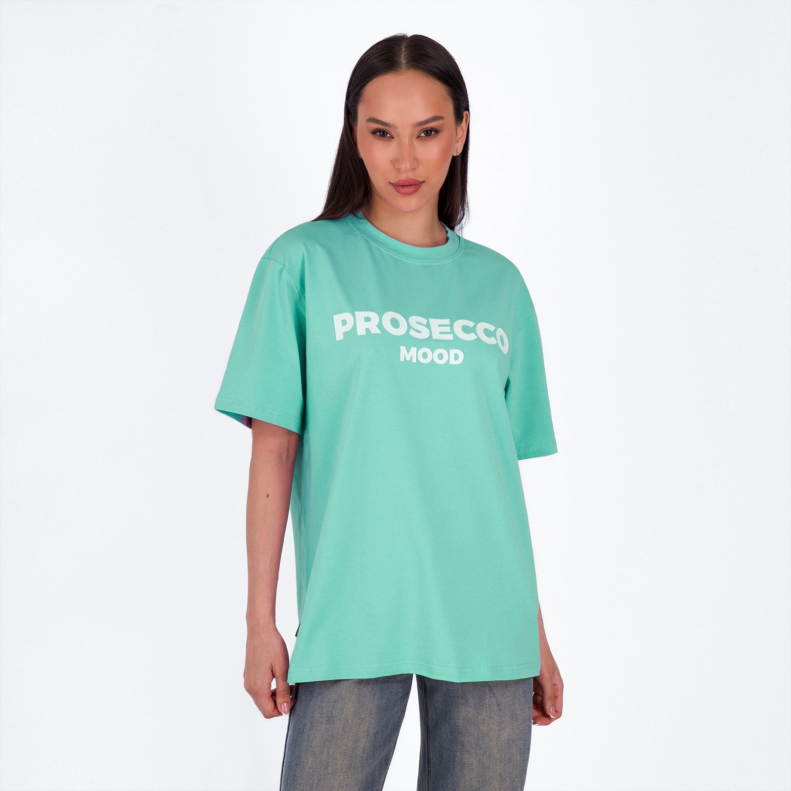 ментол Женская футболка свободного кроя, круглый вырез горловины (принт "prosecco mood").Материал: