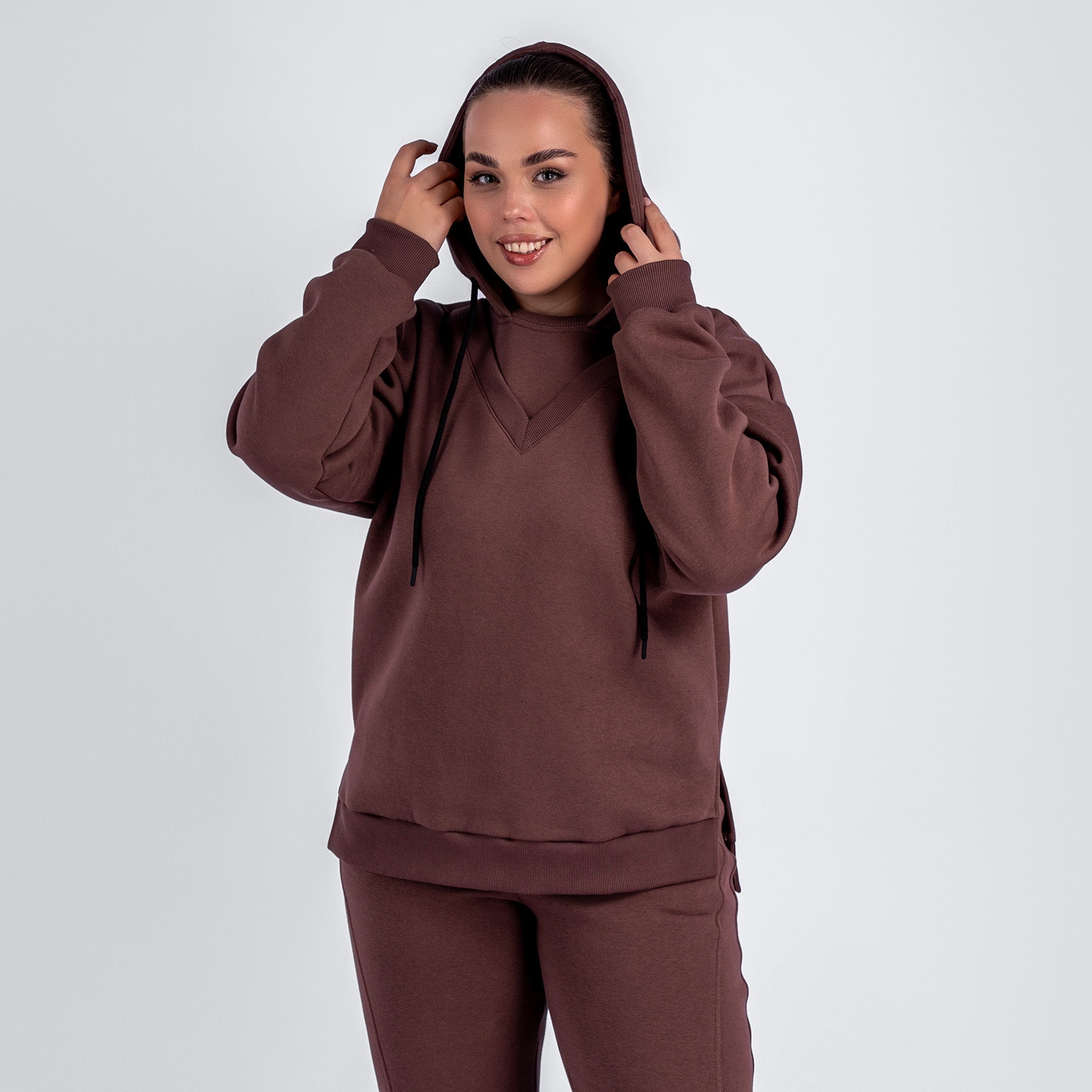 Женская худи с капюшоном и имитацией V-обр.выреза на переде, с ассиметричной линией низа с разрезами.Материал: