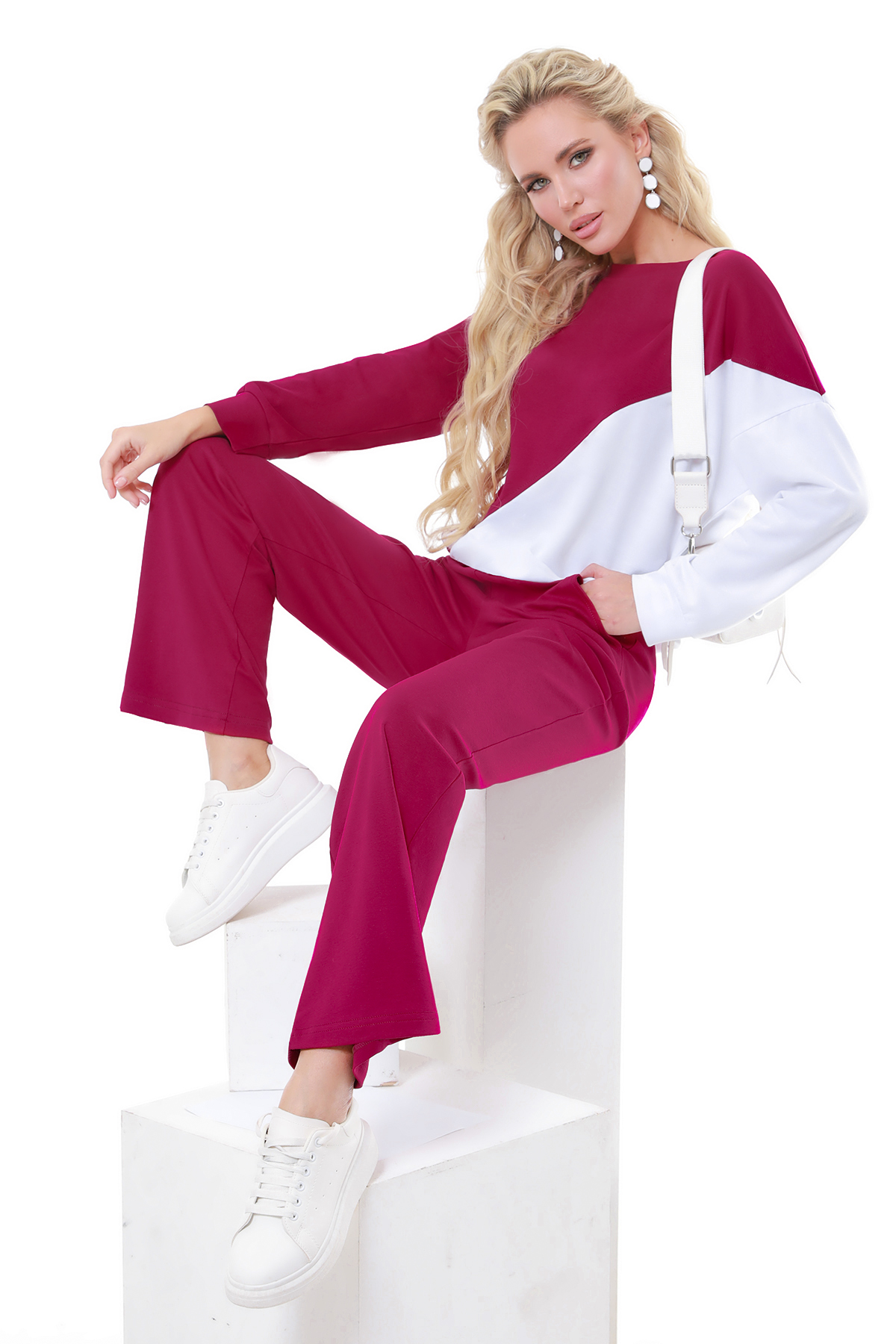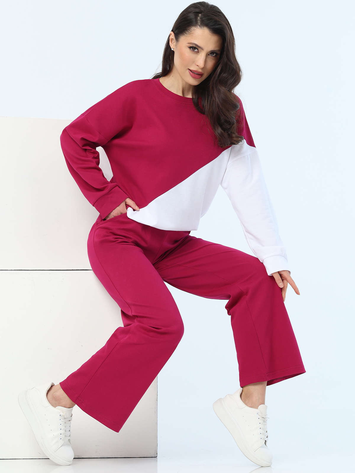 Трикотажный брючный костюм — модель в стиле спорт-шик, которая станет идеальным вариантом для повседневных встреч, прогулок, путешествий и занятий спортом. Объемный свитшот с контрастной вставкой выглядит эффектно, не подчеркивает недостатки фигуры, дарит ощущение легкости и уюта. Прямые брюки на резинке становятся идеальным дополнением к верху свободного кроя. Они создают баланс, не сковывают движений и визуально вытягивают силуэт. Два боковых кармана на брюках функциональны, но при этом не добавляют лишнего объема. Свитшот можно носить навыпуск или заправить его в брюки, чтобы создать женственный акцент на талии и преобразить силуэт. Спортивный костюм выполнен из натурального, приятного к телу хлопка, который хорошо пропускает воздух, не выцветает, не просвечивает и прекрасно переносит стирку в деликатном режиме без отжима при температуре до 30 градусов.