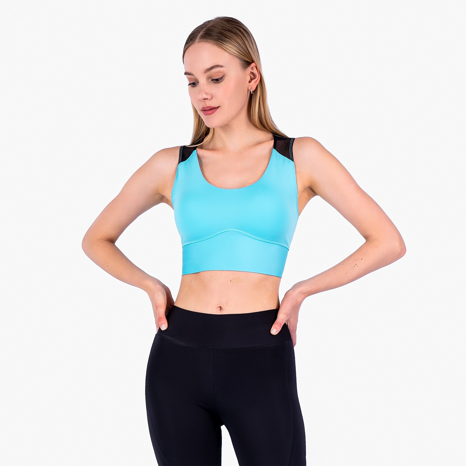 Женский кроп-топ с чашками, сеткой по спинке и поясом.Материал: