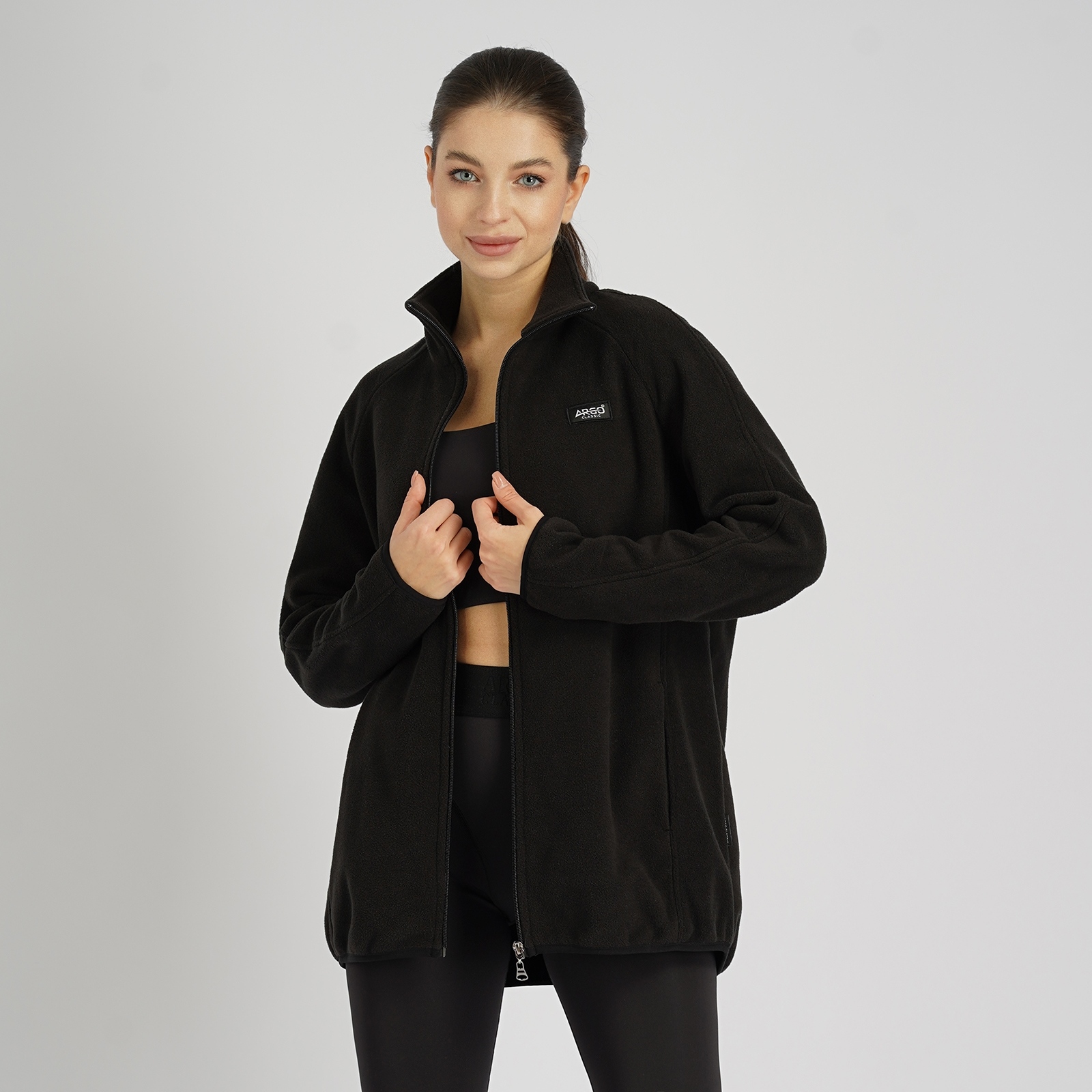 Женская куртка с воротником стойкой, на молнии и рукав реглан.