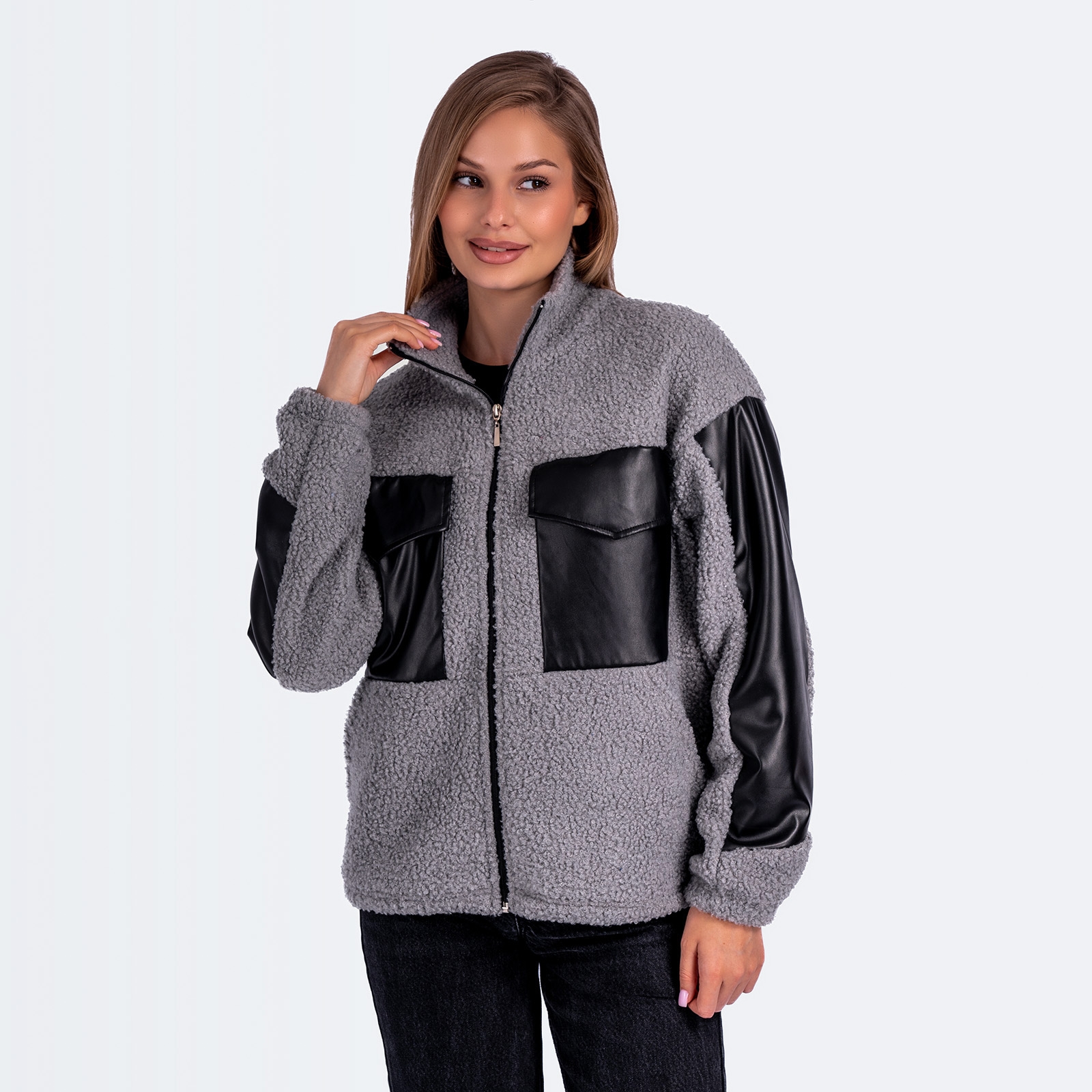 Женская куртка-толстовка на молнии, воротник-стойка, с карманами с клапанами на уровне груди.Материал: