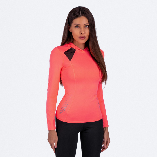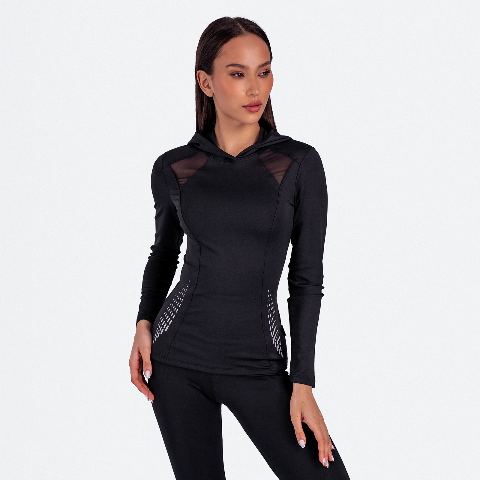 Женский лонгслив прилегающего силуэта с капюшоном и вставками из сетки (термо "светоотражающая").Материал: