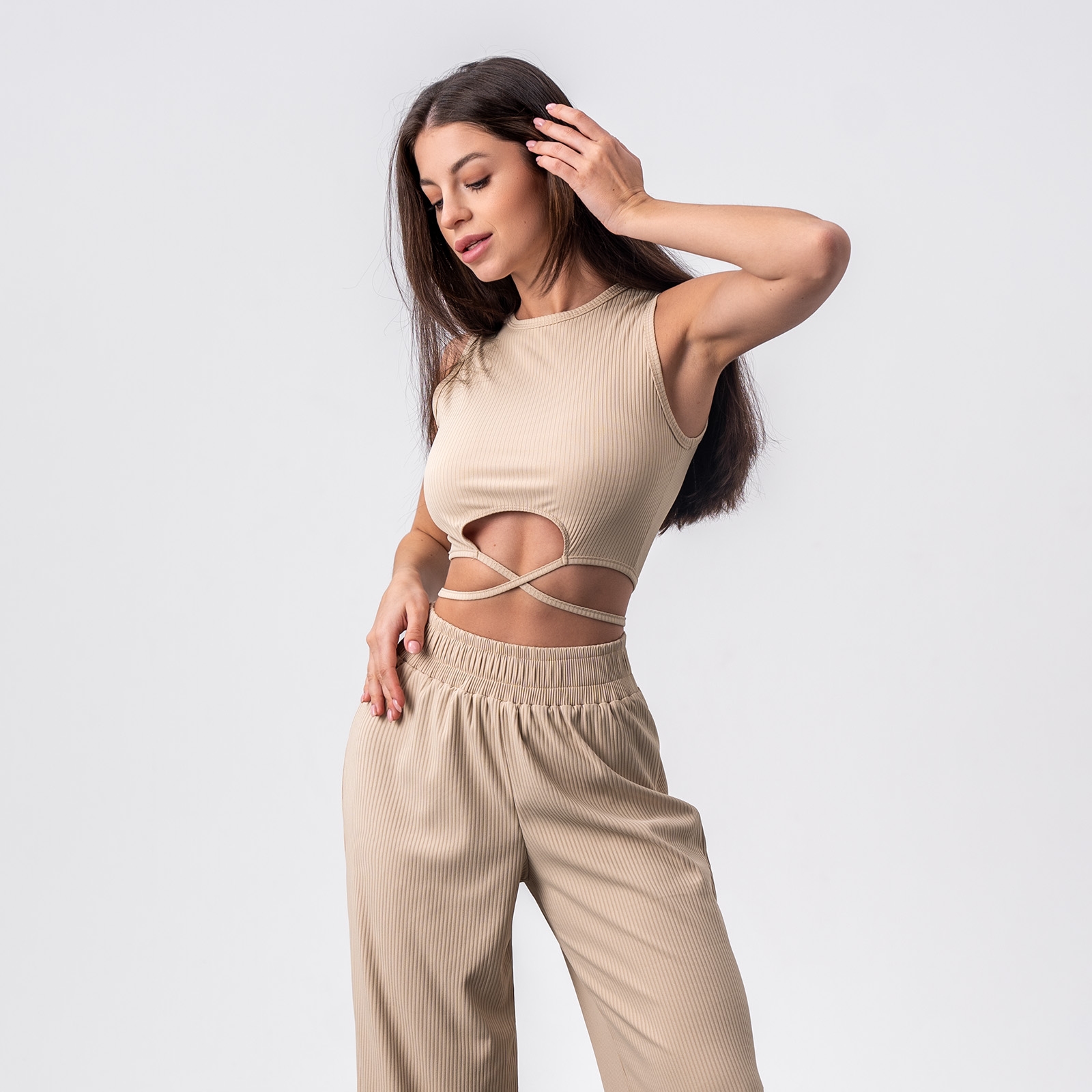 Meryl (рубчик) - "дышащая", легкая ткань, которая отличается повышенной прочностью и хорошими изоляционными качествами, позволяющими телу удерживать естественное тепло. Этот материал состоит из мельчайших волокон, прочность которых в несколько раз превышает прочность шелка. Из различных вариантов нитей Meryl создаются ткани, на ощупь и по внешнему виду не отличающиеся от хлопка и шелка, но превосходящие их по качеству. Материал Meryl быстро сохнет, прекрасно сохраняет форму, не требует глажки и устойчив к световому воздействию.Состав: 90% Polyamide, 10% Elastane бежевый