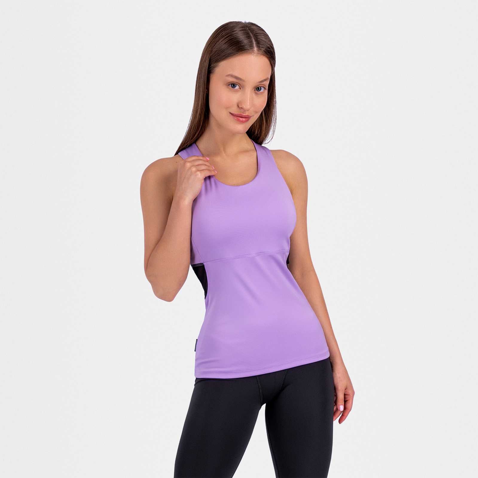 Женская спортивная майка с декоративными бретелями на спинке и вставкой из сетки.Материал: