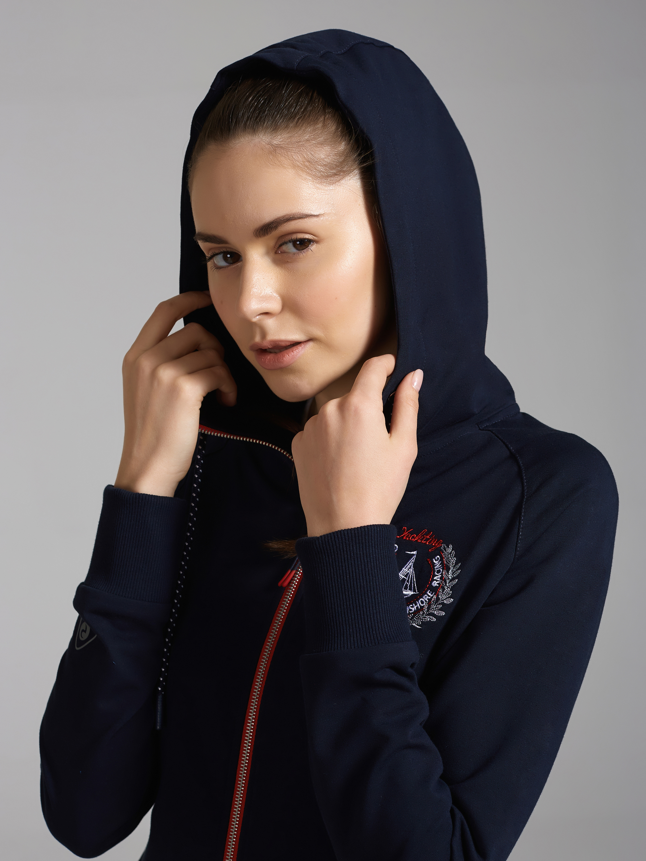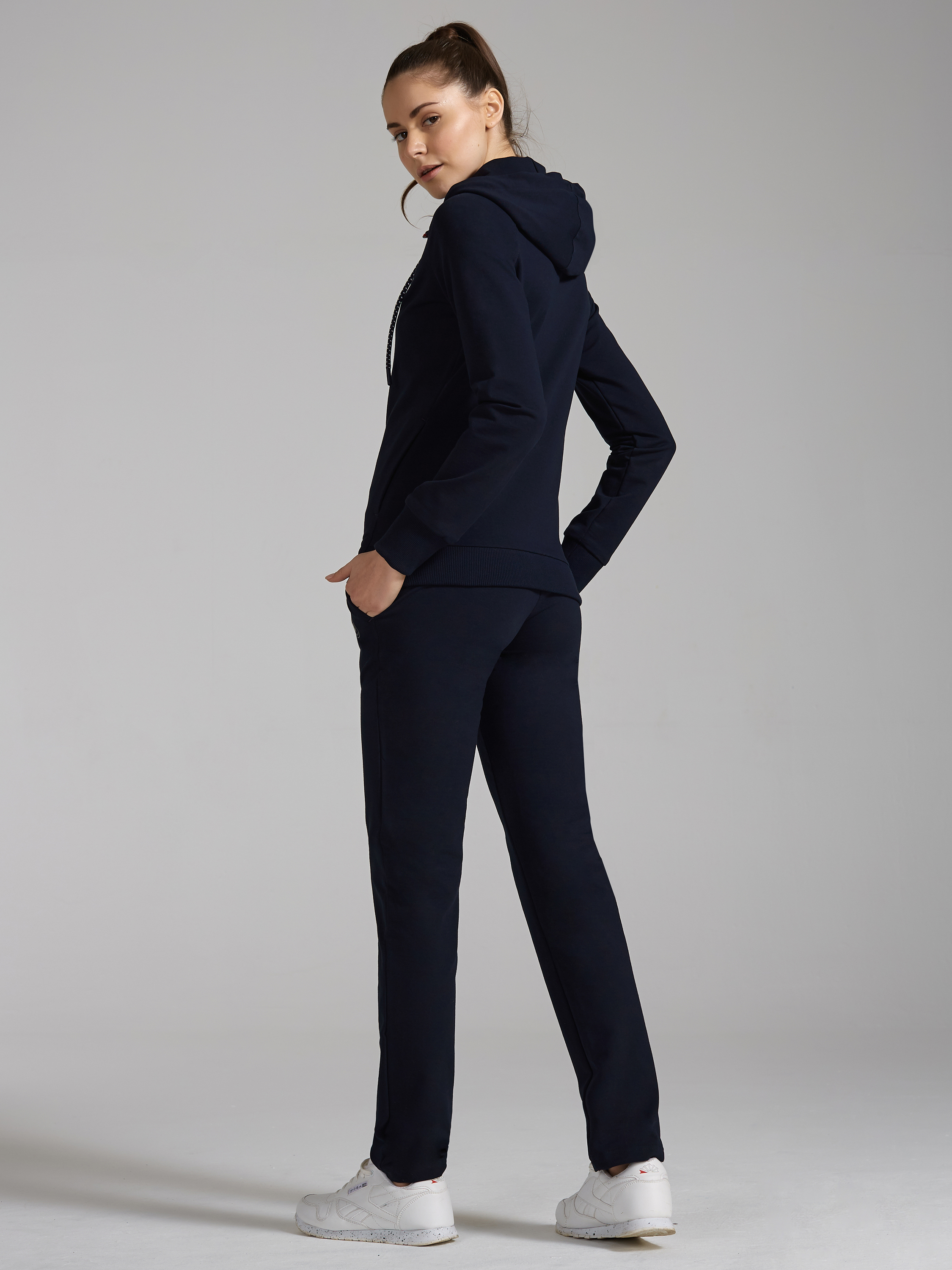 Спортивный костюм выполнен из хлопкового трикотажного полотна. Куртка с капюшонам на молнии. Рукава покроя реглан Пояс куртки и манжеты рукавов выполнены из эластичного полотна. Карманы в куртке - в рельефах, с потайной молнией. Слева на груди вышивка, спинке - принт. Брюки зауженные. Пояс брюк из эластичной рибаны. Ширина пояса дополнительно фиксируется шнуром. Боковые карманы брюк - "хулиганы". На левом рукаве, в области манжеты и на левой половине брюк нанесен термотрансфер с фирменным логотипом. 77% хлопок, 17% полиэстер, 6% эластан