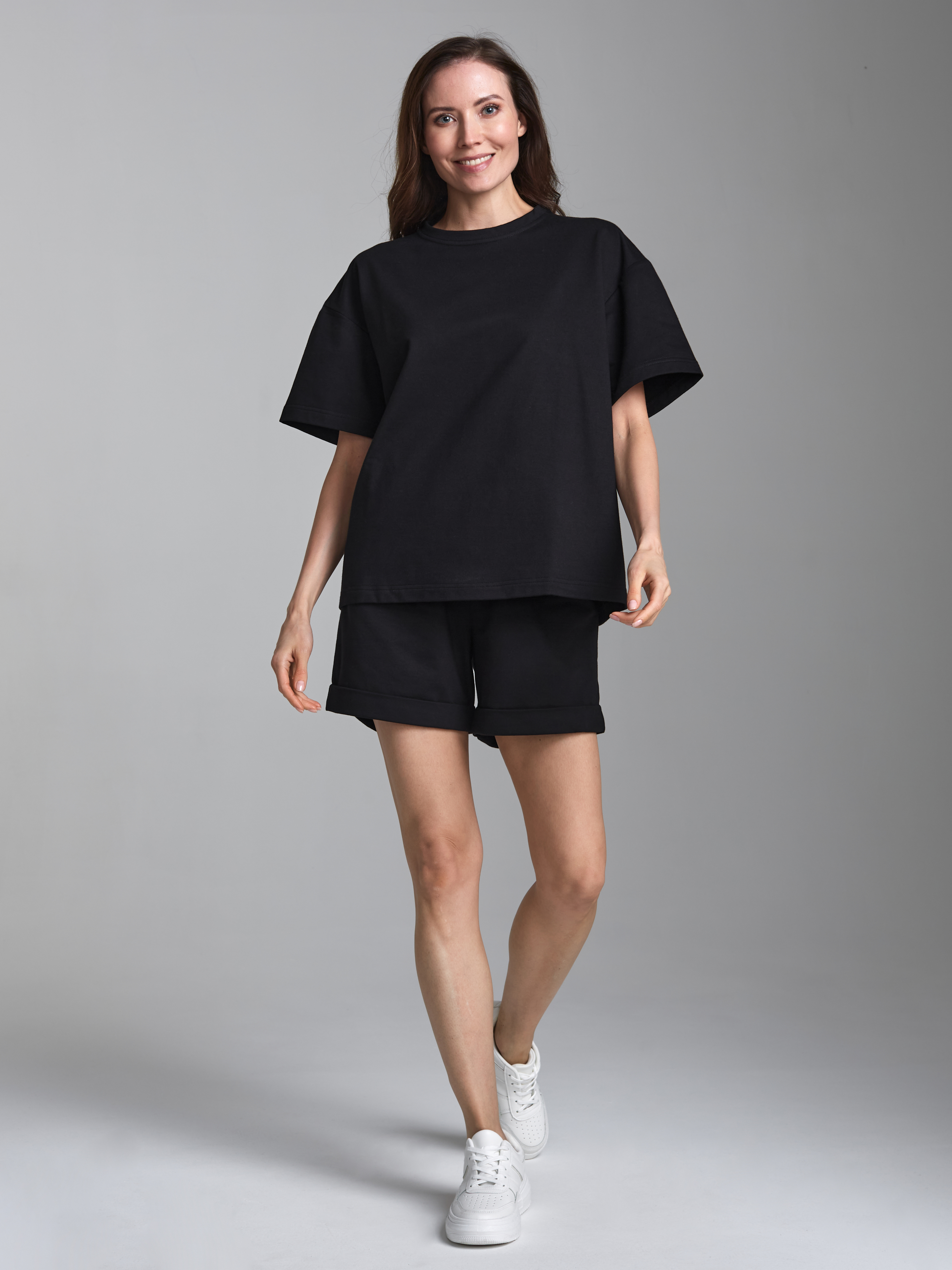 Женский спортивный костюм летний из хлопкового трикотажного полотна. Верх костюма - футболка свободного силуэта оверсайз с заниженой линией плеча, с коротким рукавом. Нижняя часть комплекта - шорты средней длины, с карманами в боковых подрезах, низ шорт - с отворотами. Пояс шорт на эластичной резинке. 95% хлопок 5% лайкра