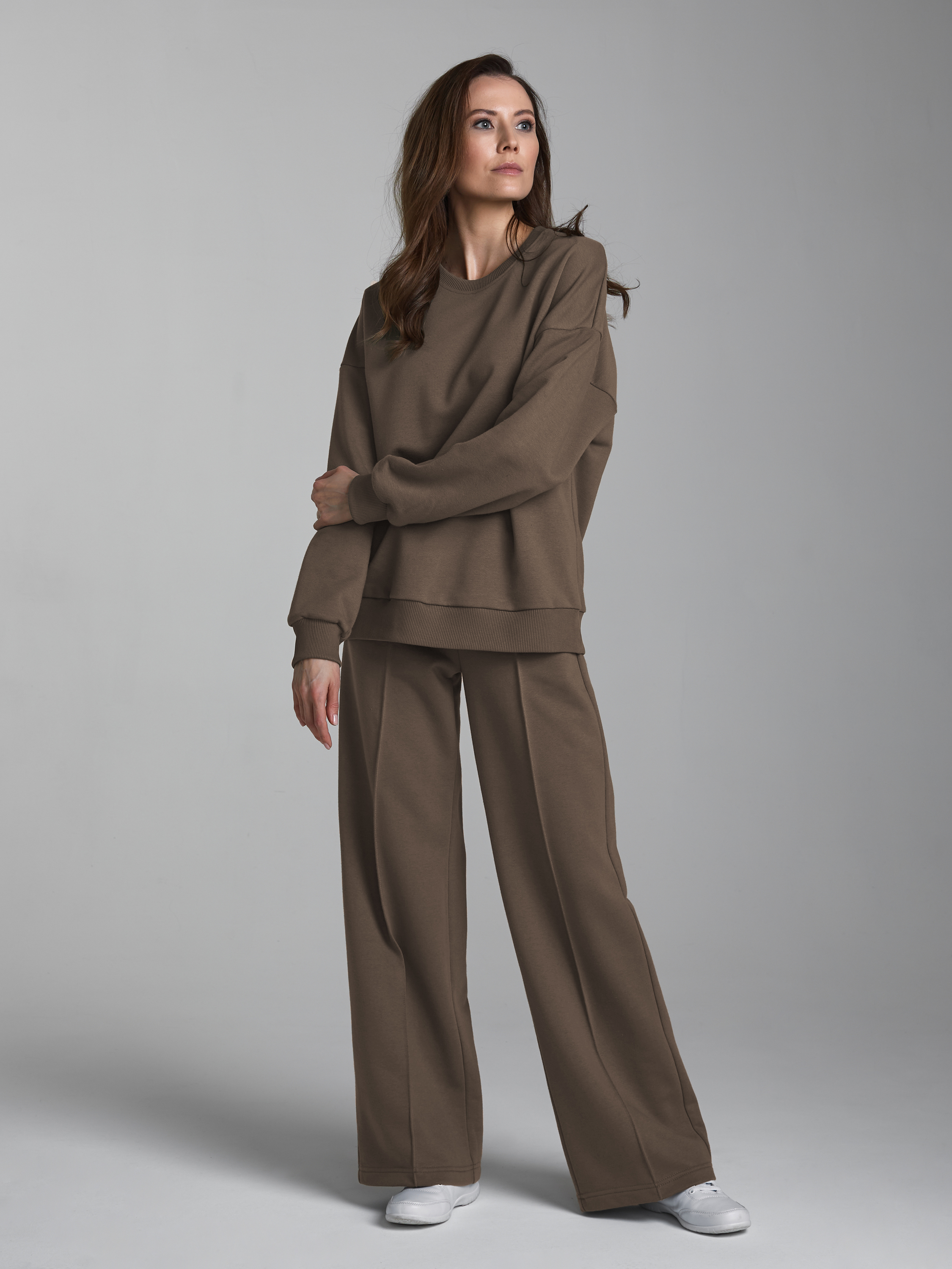 Женский спортивный костюм, из плотного трикотажа с петельной изнанкой. Сосотоит из свитшота (джемпера) и свободных брюк "Палаццо". Свитшот без застежки. Рукава втачные, широкие, со спущенной линией плеча. По вороту, низу рукавов и низу свитшота пришита рельефная вязанная резинка. Брюки "Палаццо" облегающие по бедрам и широкие по линии низа со стрелкой впереди. Карманы в боковых подрезах. Пояс брюк широкий, с эластичной тесьмой дополнительно регулируется шнуром. 80% хлопок, 20% полиэстер