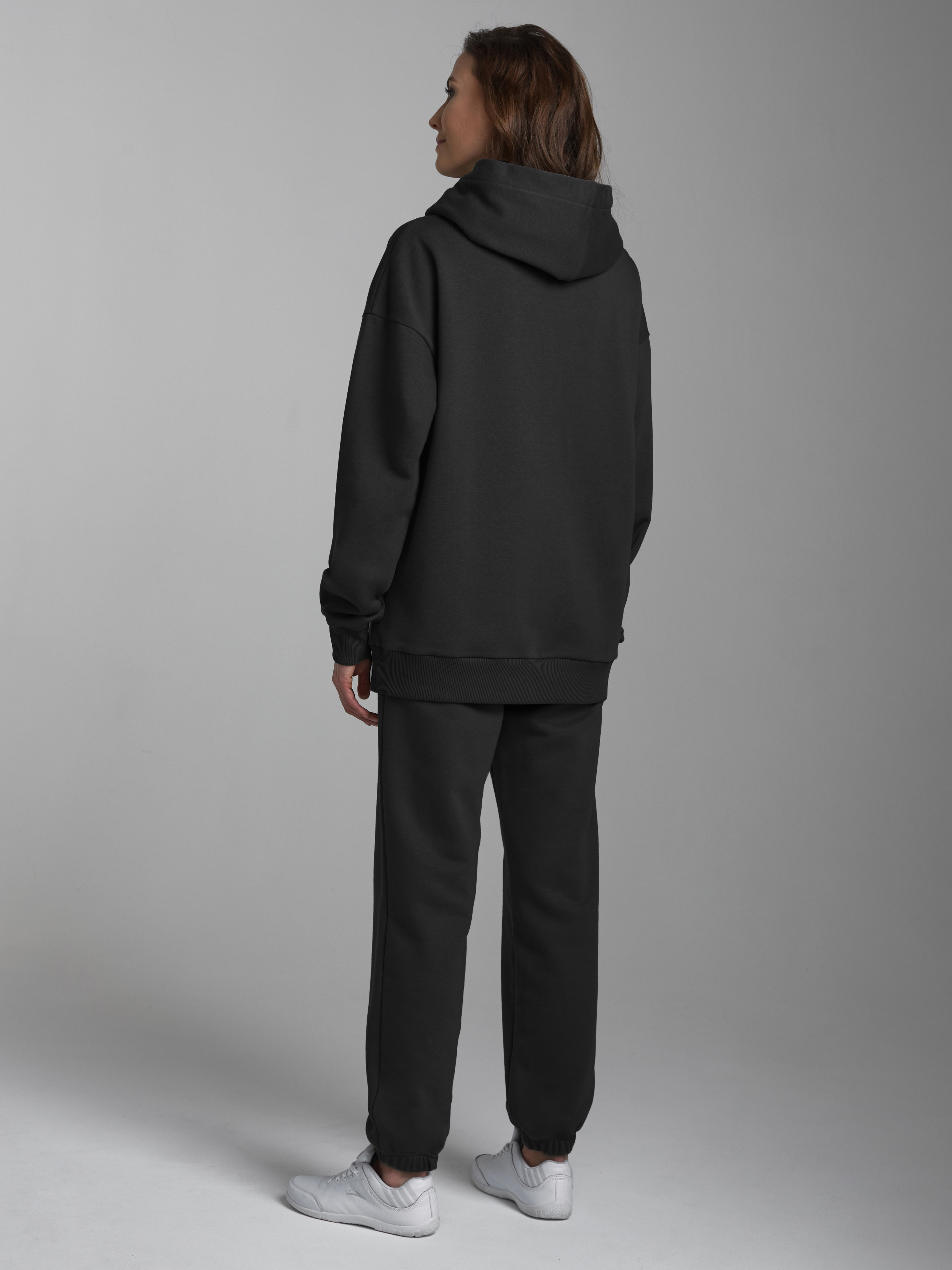 Женский спортивный костюм из плотного трикотажа с петельной изнанкой. Верх комплекта - толстовка-худи Оверсайз с капюшоном, с накладным карманом "кенгуру". Рукава толстовки втачные, свободные с заниженной линией плеча и с эластичными манжетами. Брюки свободные, на высоком поясе, книзу заужены на резинку. Карманы брюк наклонные, прорезные, с бочком. Пояс брюк по линии талии дополнительно регулируется шнуром. 80% хлопок, 20% полиэстер