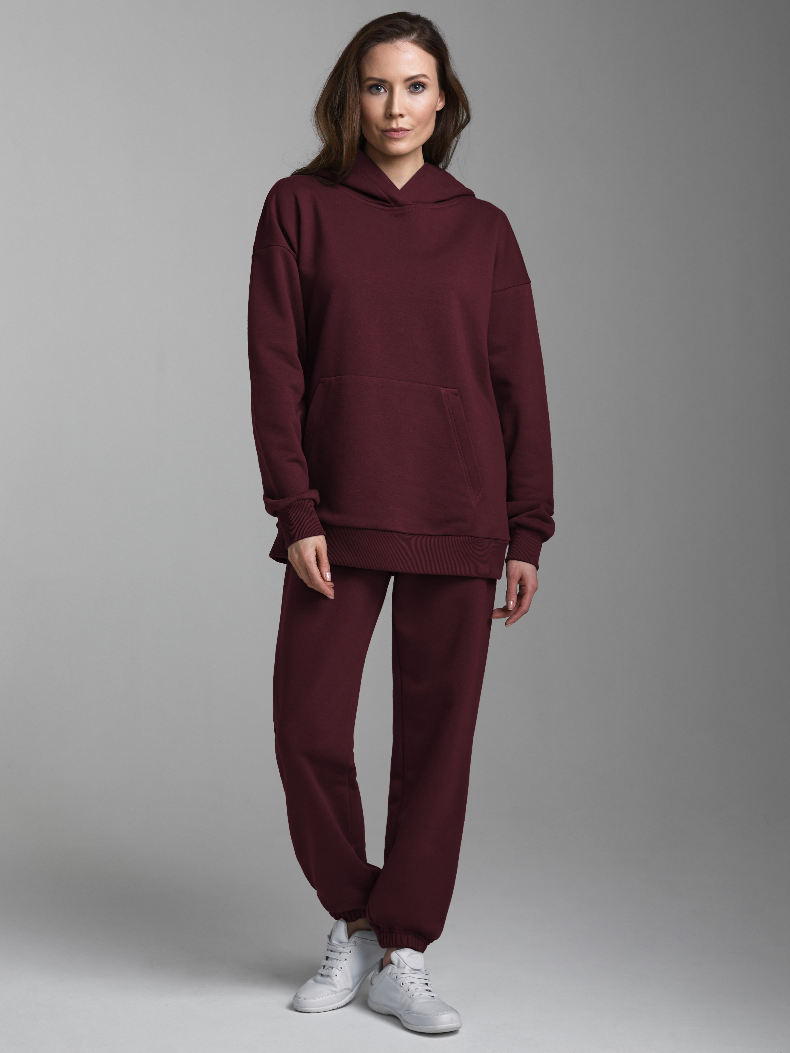 Женский спортивный костюм из плотного трикотажа с петельной изнанкой. Верх комплекта - толстовка-худи Оверсайз с капюшоном, с накладным карманом "кенгуру". Рукава толстовки втачные, свободные с заниженной линией плеча и с эластичными манжетами. Брюки свободные, на высоком поясе, книзу заужены на резинку. Карманы брюк наклонные, прорезные, с бочком. Пояс брюк по линии талии дополнительно регулируется шнуром. 80% хлопок, 20% полиэстер