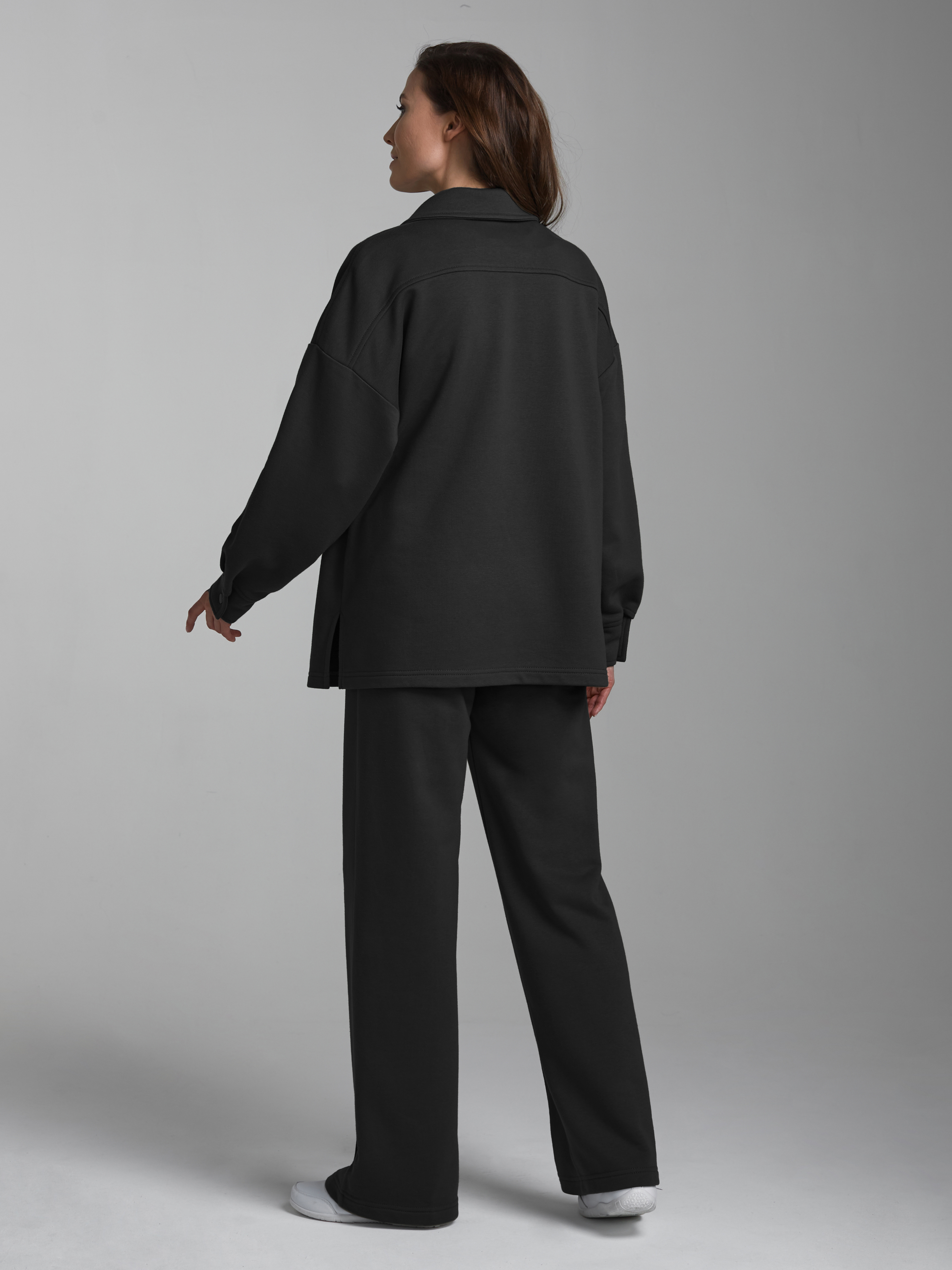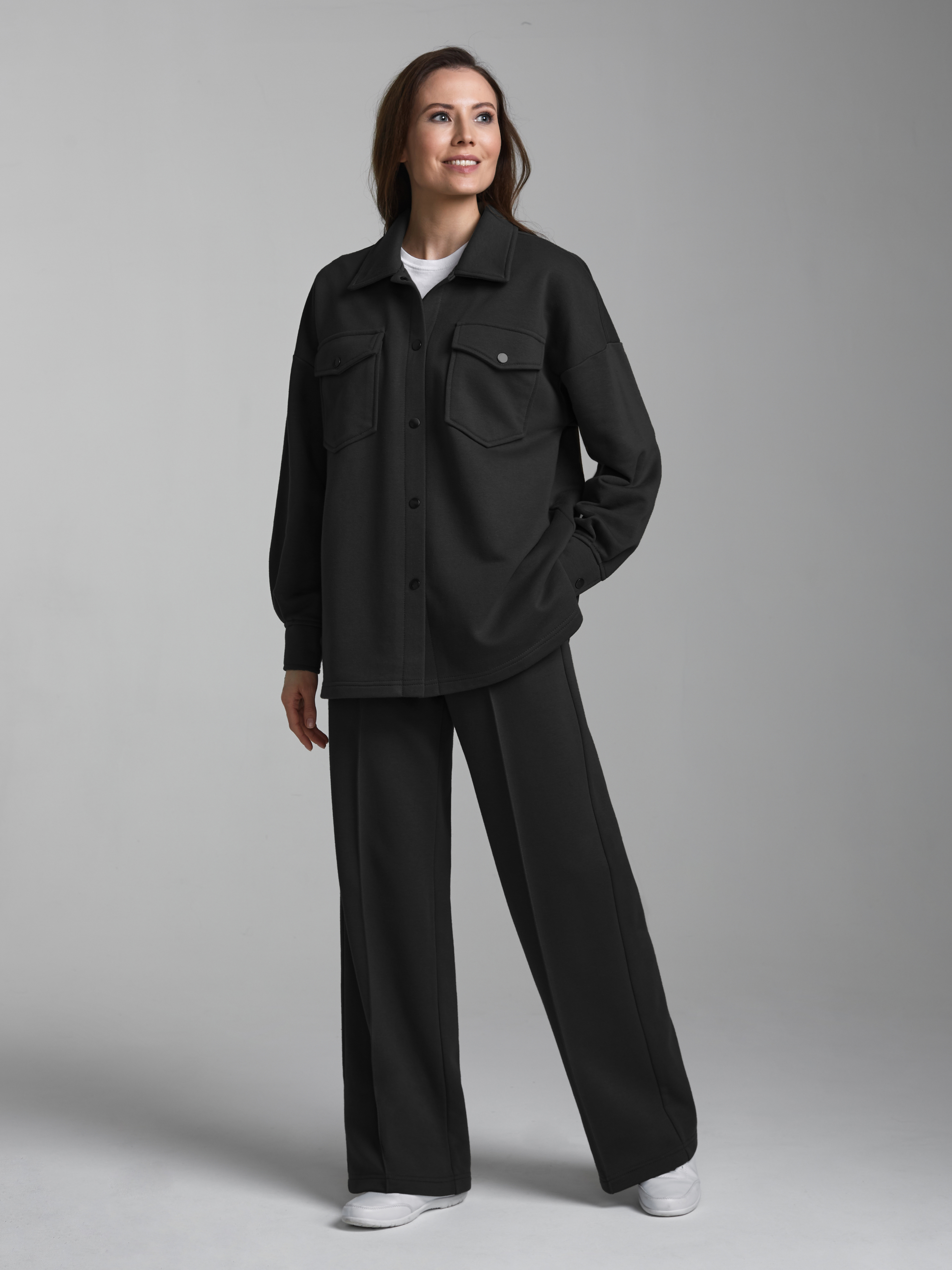 Женский кромплект из плотного и мягкого хлопкового трикотажного полотна с петельной изнанкой. Состоит из толстовки-рубашки Оверсайз и свободных брюк "Палаццо". Рукава рубашки втачные, свободные, со спущенной линией плеча. Широкие манжеты застегиваются на кнопки. Тостовка имеет два накладных нагрудных кармана с клапанами. Воротник стояче-отложной. Застегивается изделие на металлические кнопки. Брюки широкие, силуэта "палаццо" со стрелкой впереди. Карманы брюк наклонные, прорезные, с бочком. Широкий элластичный пояс брюк дополнительно регулируется шнуром. 80% хлопок, 20% полиэстер