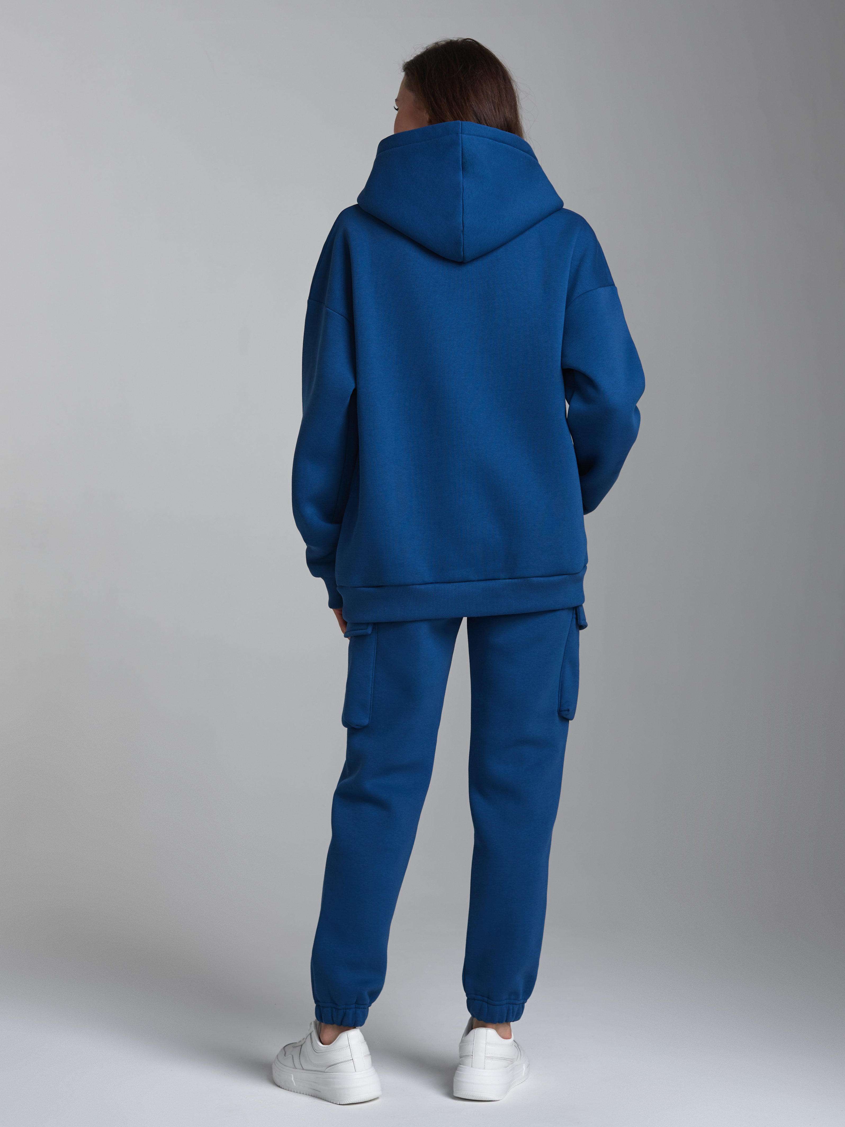 Спортивный костюм выполнен из хлопкового трикотажного полотна с изнаночным начесом. Рукава рубашечные, свободного кроя, с удлиненным плечевым швом, на манжете. Низ толстовки с широким поясом из трикотажной резинки. Накладные карманы "кенгуру".Брюки в стиле "карго". Карманы верхние прорезные с бочком. Есть дополнительные боковые накладные карманы, объемные, с клапанами. Низ брюк заужен и присобран на манжету с эластичной резиной. Пояс брюк дополнительно регулируется шнуром 65% хлопок, 35% полиэстер