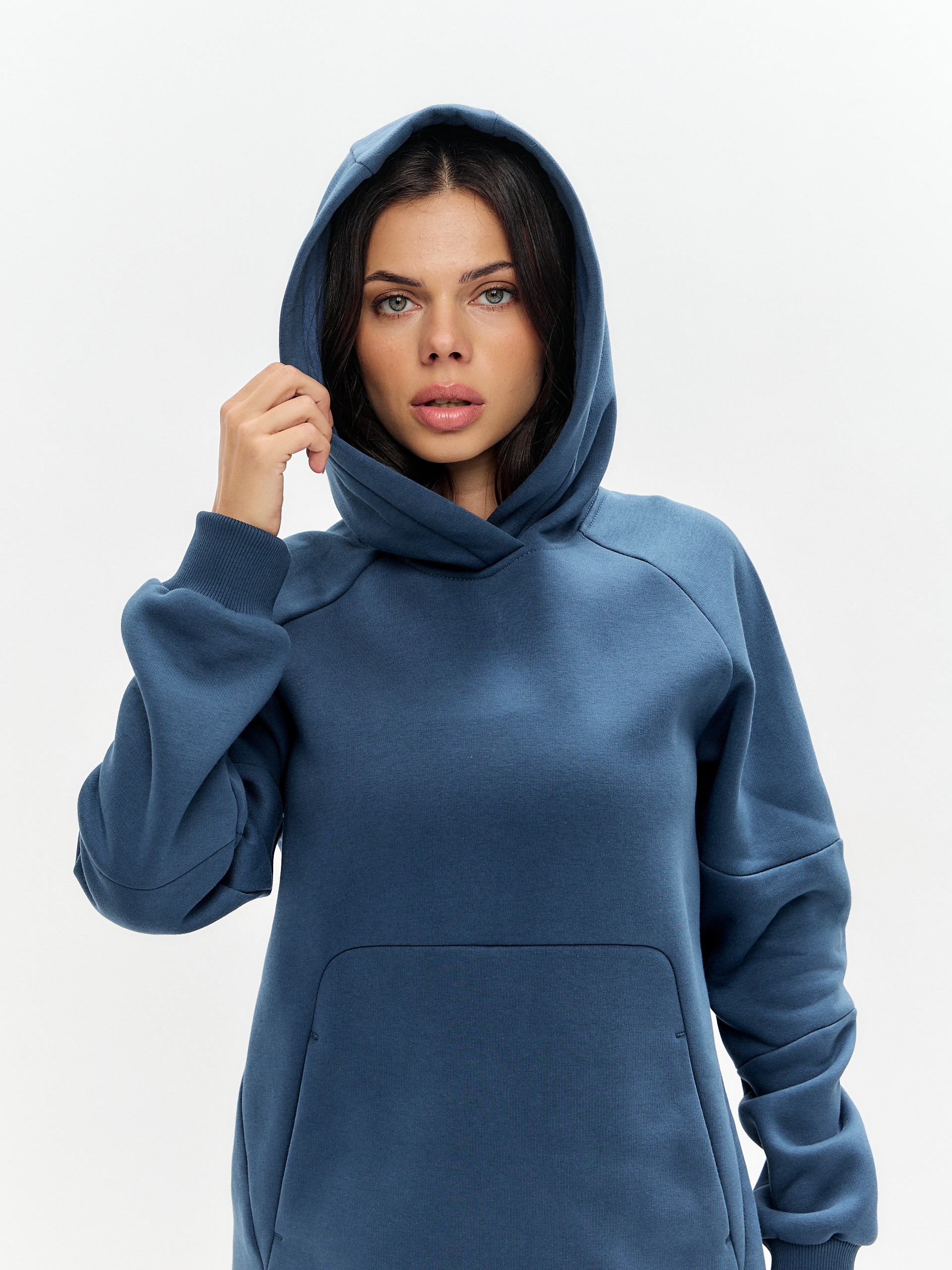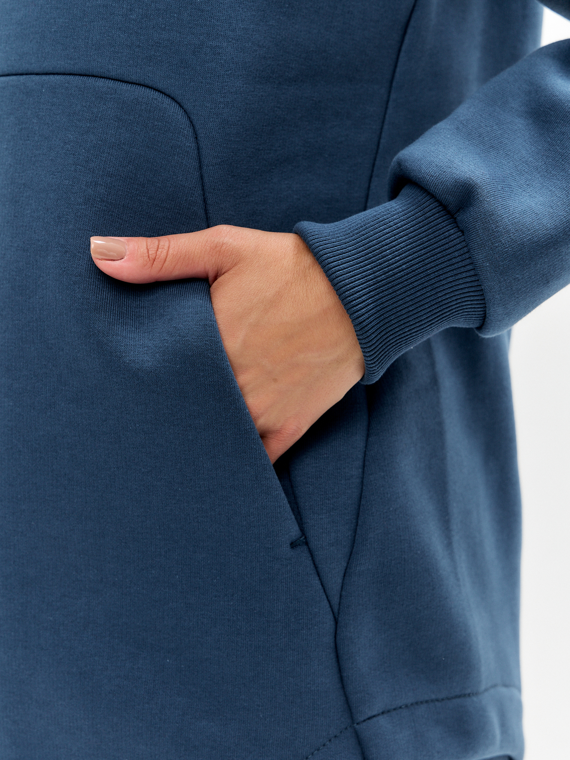 Женский артикул 12L-RR-1874 индиго цвета спортивный спортивный костюм из плотного хлопкового трикотажного полотна с начесом. Костюм состоит из удобной толстовки «худи» свободного прямого силуэта. Капюшон двойной. Модный карман «Кенгуру» выполнен в подрезе. Форма кармана подчеркивает округлую форму низа изделия. Удобные рукава покроя реглан украшены горизонтальными вставками. Брюки заужены книзу широкими манжетами. Боковые карманы брюк наклонные. Пояс брюк по линии талии с эластичной резинкой, дополнительно регулируется шнуром. Костюм создан для повседневного комфорта в прохладное время года. 65% хлопок, 35% полиэстер
