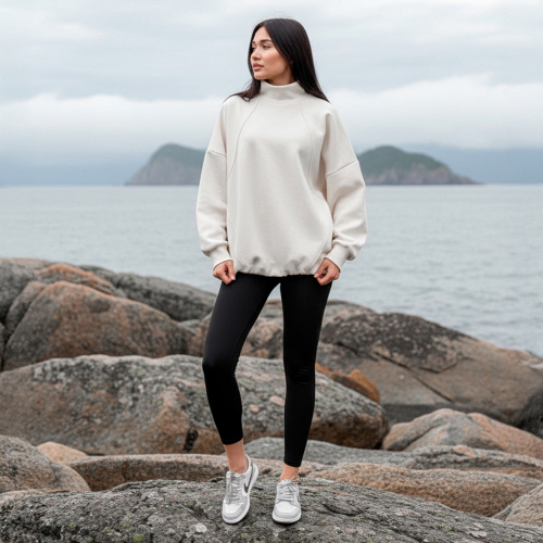 Женский свитшот с резными линиями, высоким воротом-стойкой и кулиской по низу.Материал: